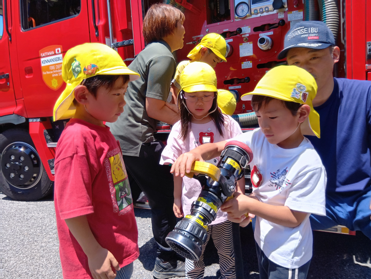 外に出ると次は放水ロープの説明です。今回は実際に持たせてもらえる事となり、子どもたちも真剣な表情で聞き入っています。消防士から個々に使い方や持ち方を教わりました。実際に手に持ってみるとゴツゴツしていたり、重かったりと感じることが様々で、友だちや保育者に感じたことを楽しそうに共有していました。