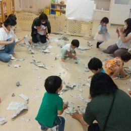 年齢にかかわらず色々な子が思い思いにクレヨンを持って描いた絵は、豪快に紙いっぱいに描く子、集中して緻密に描く子、何色ものクレヨンを使ってカラフルに描く子等、様々な個性が混ざり、一人ではできない素敵な作品に仕上がりました。