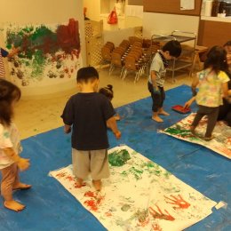 縁側では絵の具を使って「どこでもアート」です。はじめは模造紙に筆で大人しく描いている子が多かったのですが、段々と大胆になってきて、窓ガラスや手足、最後は顔までキャンバスになっている子もいました。