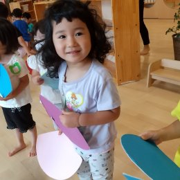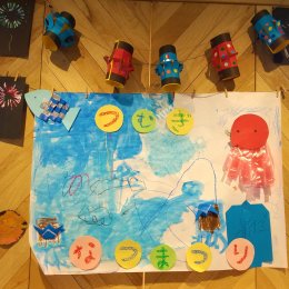 そして、園庭では他にも木を使ったキーホルダー作りと、大きな紙へのダイナミックお絵描きを行いました。 2階のテラスに設置したお絵描きコーナーでは、大きな模造紙に自由に絵を描いて遊びました。普段よりも大きなキャンバスに想像力が刺激されたのか、個性豊かな素敵な作品がたくさんできました。