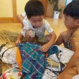キーホルダーは、木の枝を切るところからスタートします。保護者の方と一緒にのこぎりで枝を切り、やすりがけをしてから思い思いの絵を描いて作りました。小さなキーホルダーなので、描くのが難しいかと思いましたが、どの子も集中して細かい絵を描いていました。できあがると、「見て見て!」と嬉しそうに見せました。