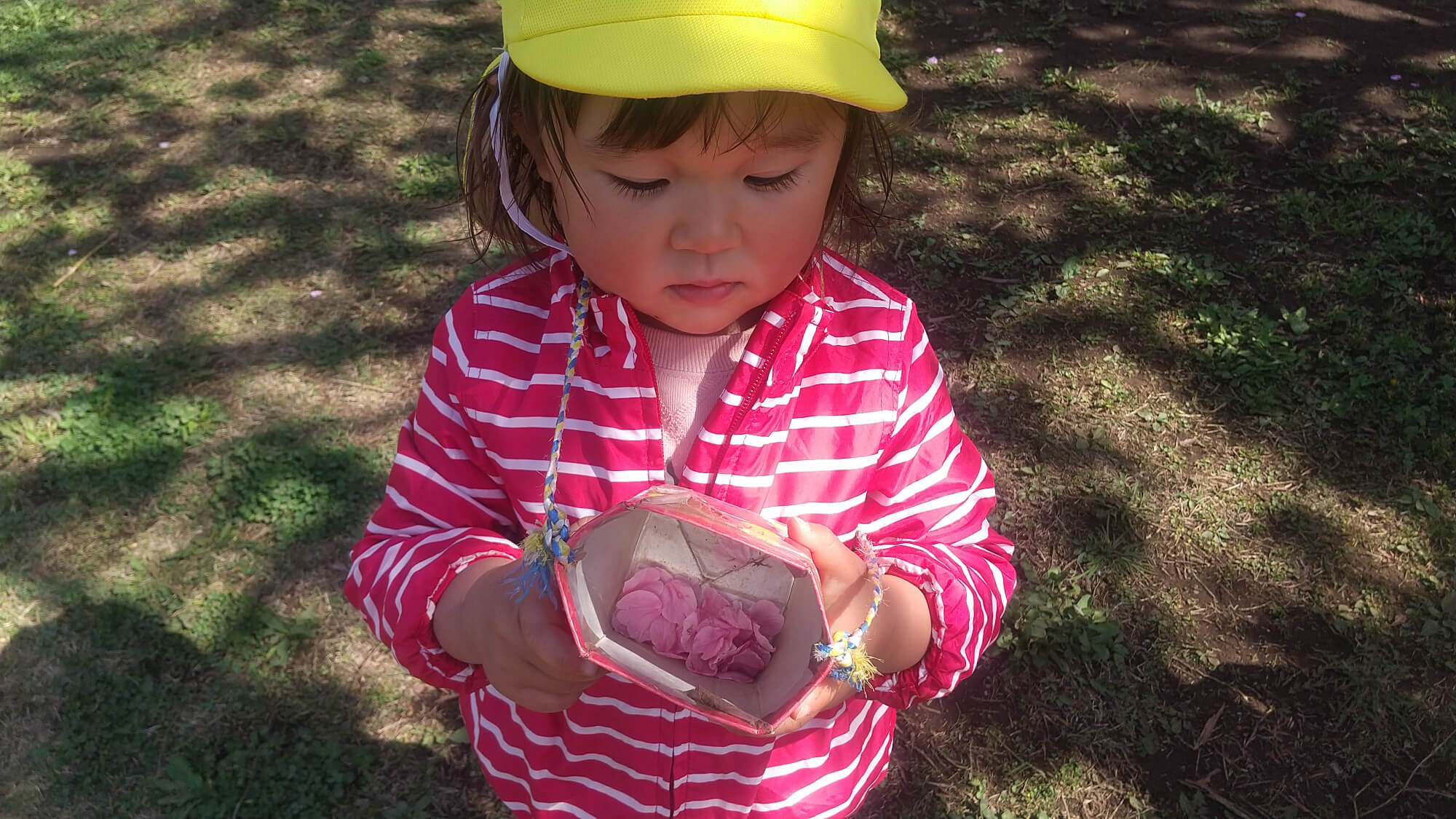 お散歩中、公園の隅でしゃがみこんで黙々と遊んでいる子がいたので、お散歩バッグの中を覗いてみました。