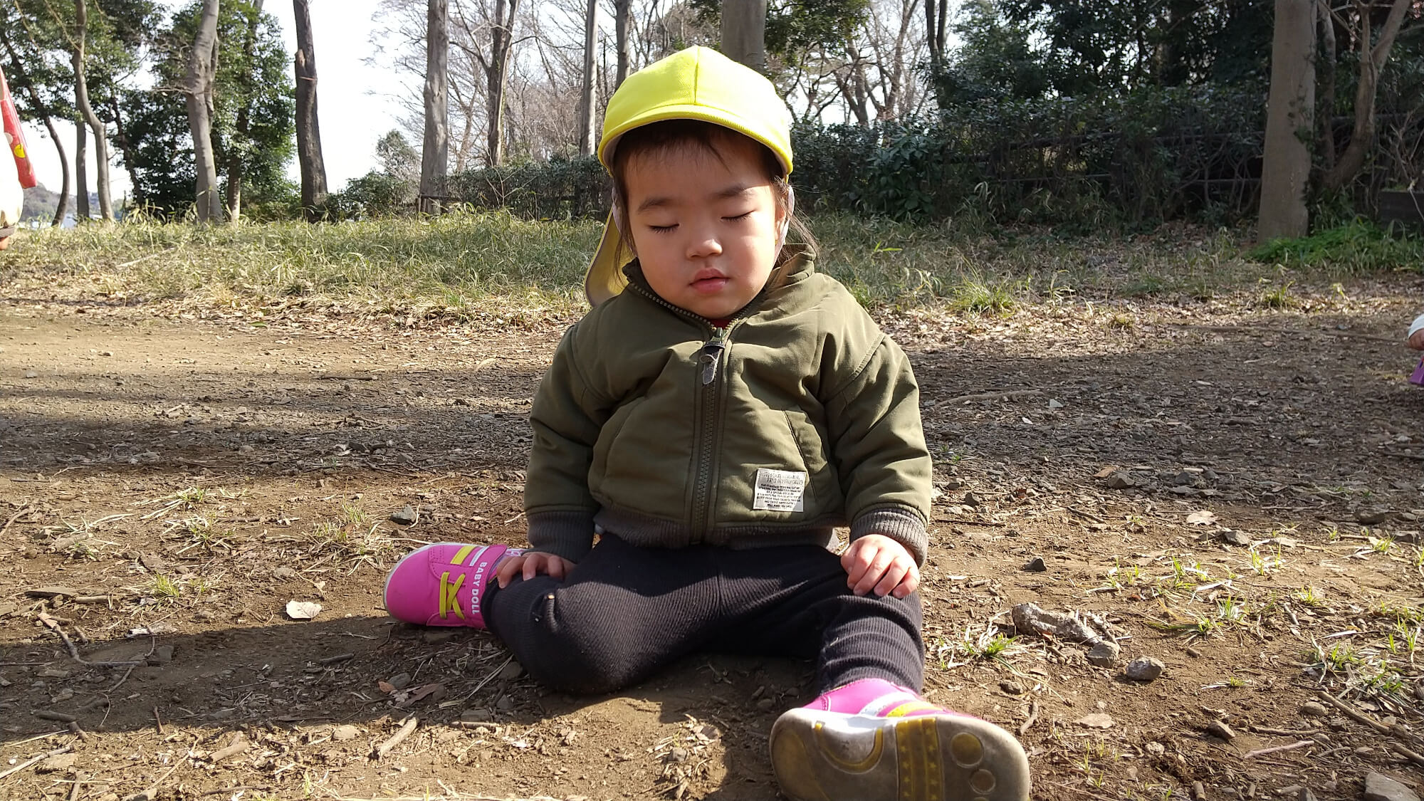 一年前はまだハイハイしていた0歳児も今ではしっかり歩けるようになり、公園までお友だちと手をつないで行けるようになりました。たくさん歩いて、公園でも走り回り、疲れ切ってうとうと・・・、楽しい夢でも見ているのかもしれませんね。