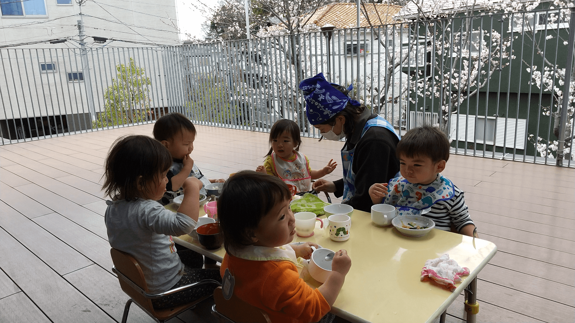 保育園の横を通っているせせらぎ緑道沿いの桜が咲くと、テラスで給食やおやつを食べる時には、毎日特等席でお花見ができます。