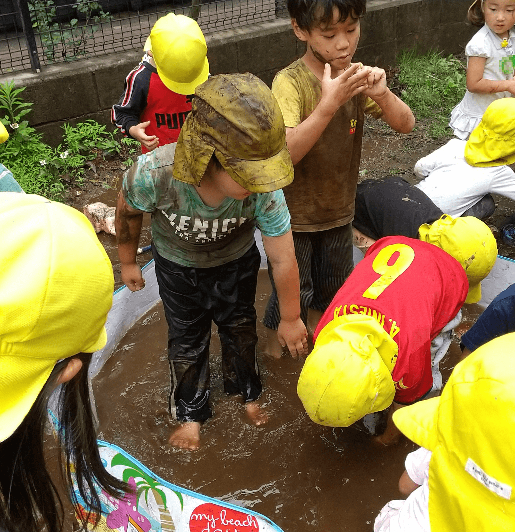 そんな泥遊びの様子を遠くから見ていた子や「泥やだ」と言っていた子たちも保育者や友だちに誘われたり、みんなが楽しそうに遊んでいる姿を見て自分から仲間に加わり、泥遊びを楽しむ姿がみられました。