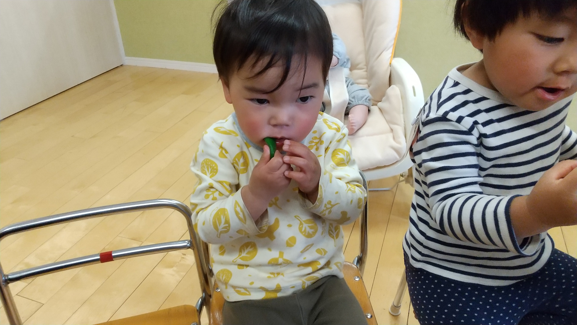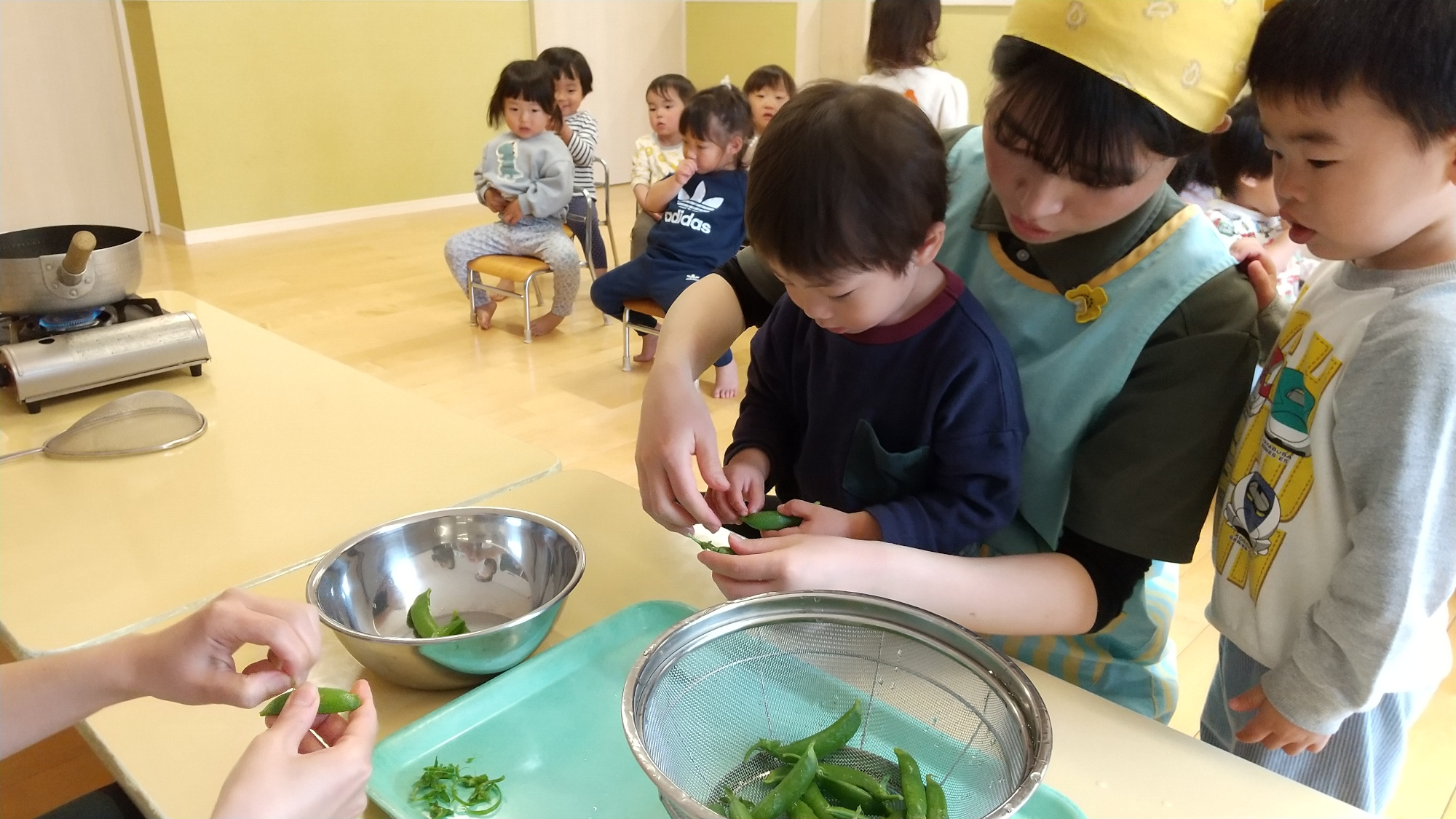 茹でたスナップエンドウを食べる時には、嬉しそうに口に頬張る子や、「これはなんだろう?」と不思議そうに見つめる子、スナップエンドウの中の豆だけを出して食べる子、もっと食べたいと手を伸ばしている子など子どもたちの姿は様々でした。