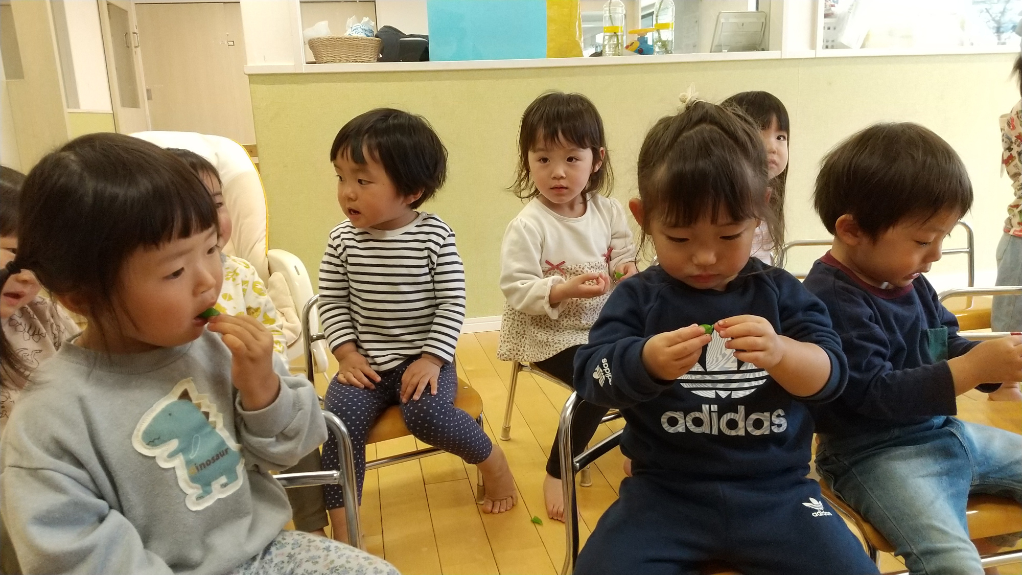 馬場どろんこ保育園「収穫したスナップエンドウを食べる」