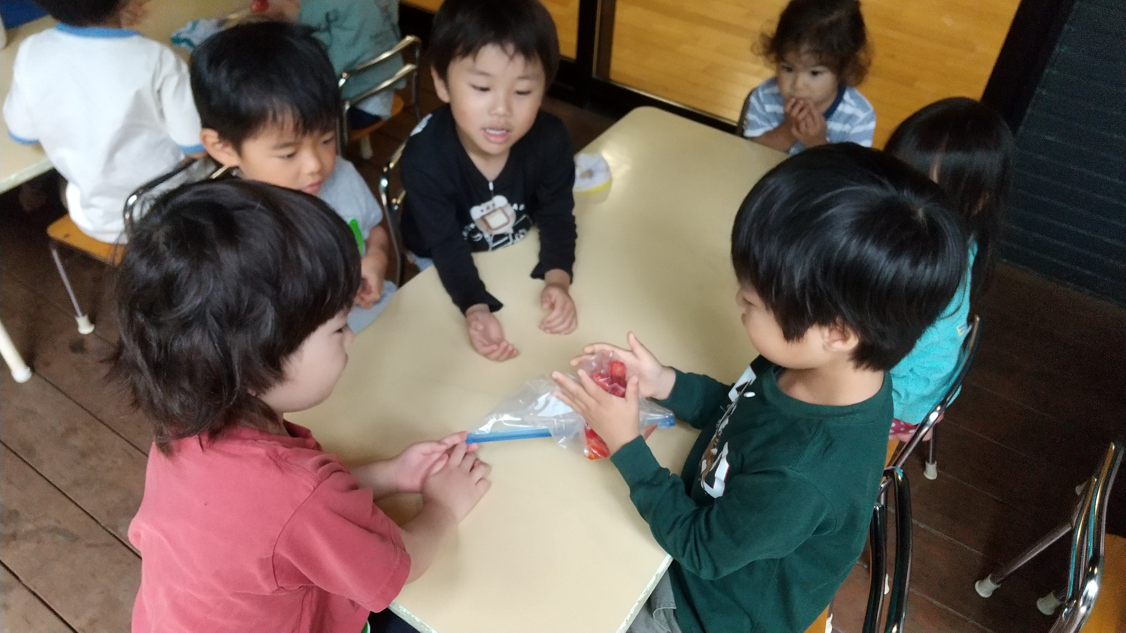 イチゴジャム作りを伝えると「はやく食べたい!」と楽しみにする子どもや、「どうやって作るのかな?」とイチゴジャム作りに関心を寄せる子どもたちの姿が見られました。