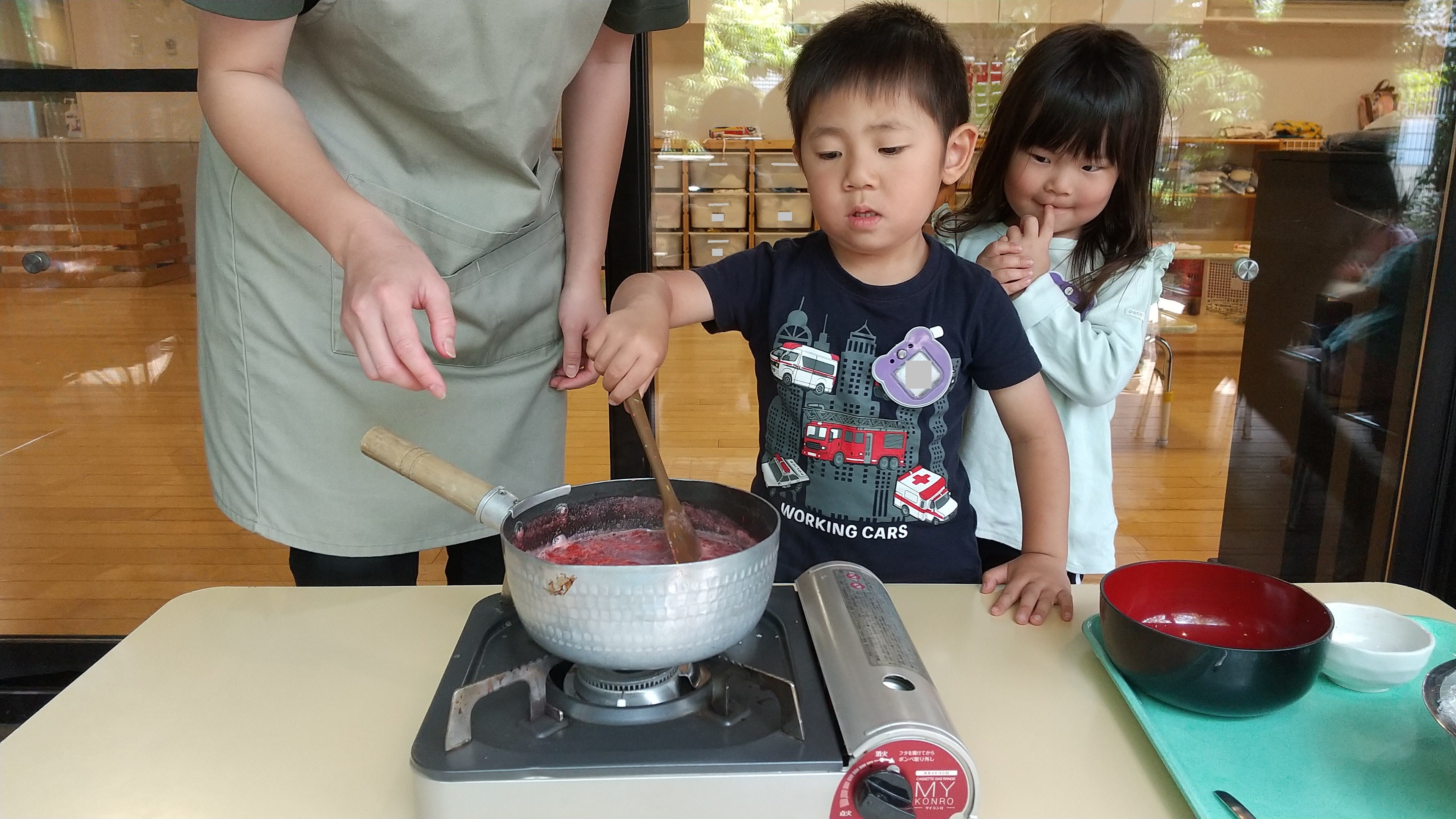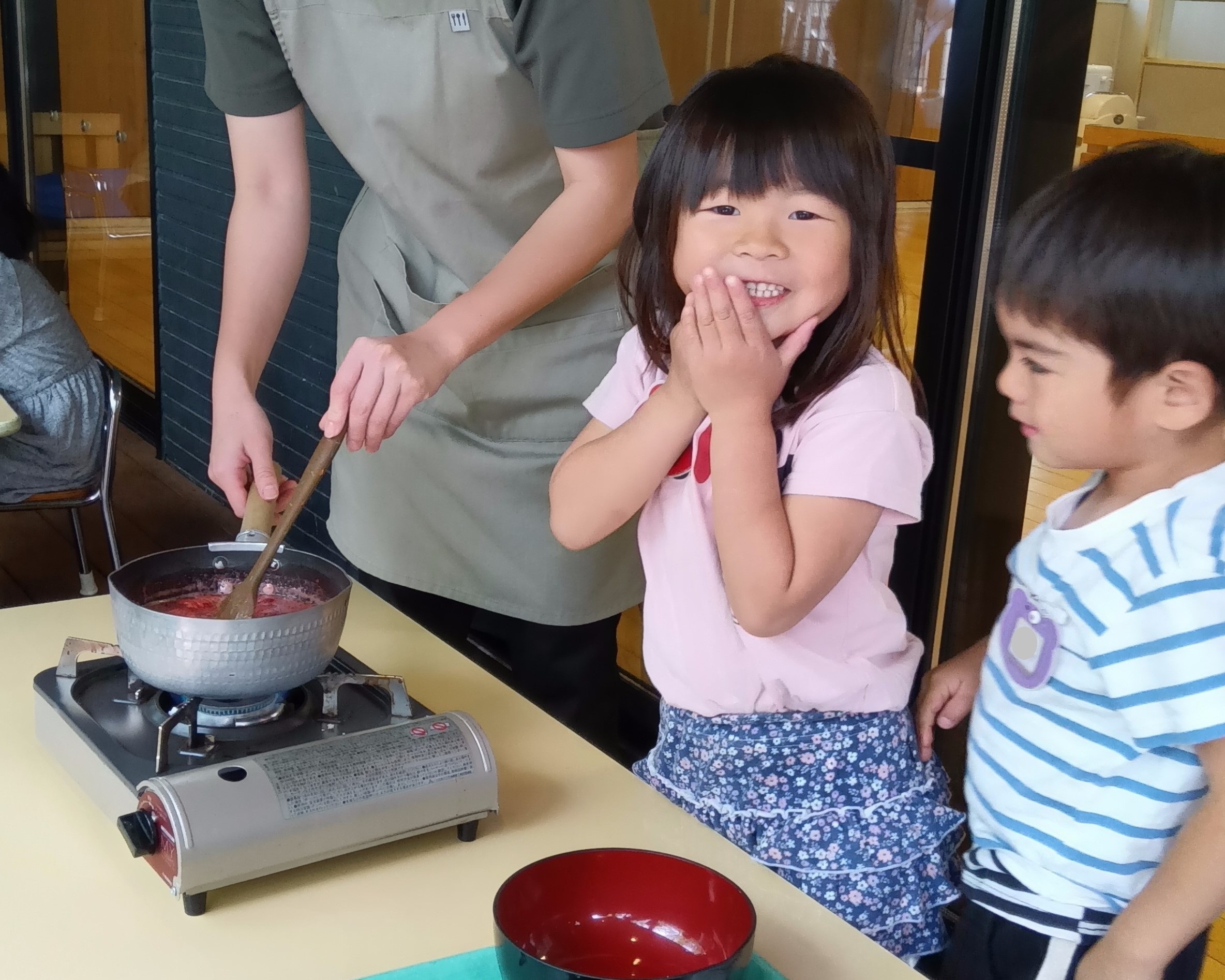 みんなで潰した色鮮やかなイチゴを鍋に入れてから火にかけ、ヘラで順番にかき混ぜました。徐々にジャムの香りが一帯に広がり、「甘い匂いだね」と嬉しそうに話す子どもたちの姿が見られました。