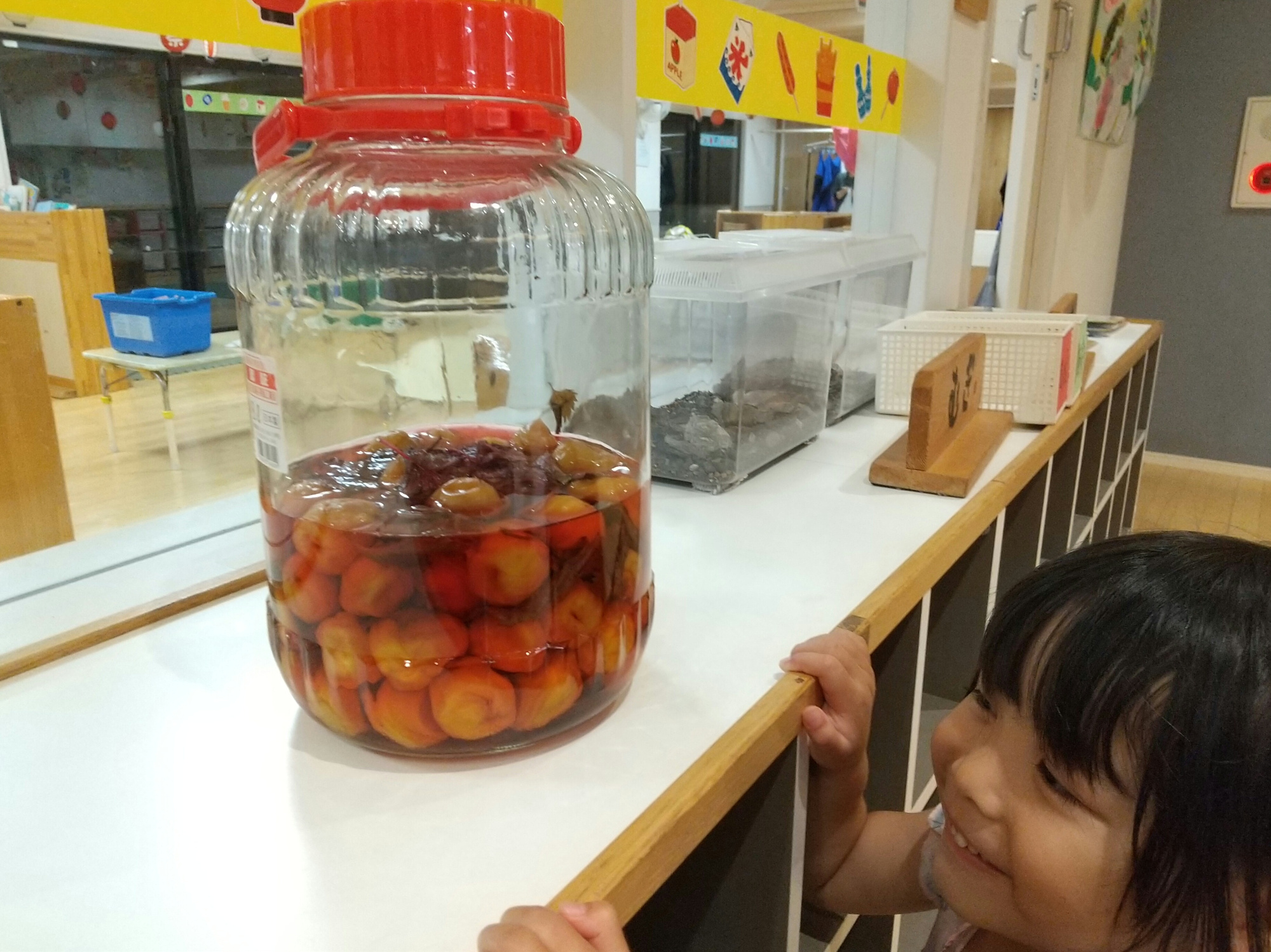 赤紫蘇を加える際、保育者が「梅干しって何色かな?」と聞いてみると、「赤!」と答え、「今は緑だけど、赤紫蘇を入れると赤い梅干しになるのかな?」と考える子どもたちでした。