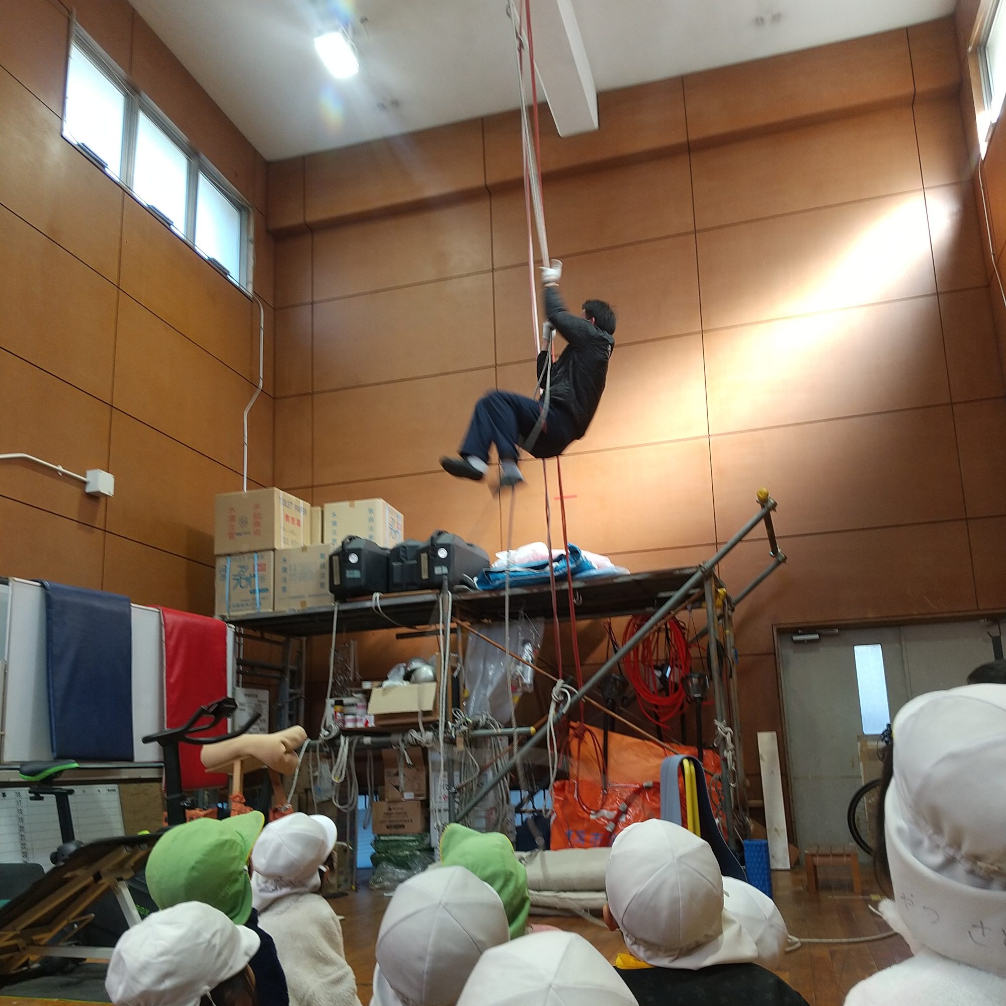 また、消防署の中も見学させていただき、消防士さんがどのように生活し、どんな訓練をしているのかを教えてもらいました。消防士さんからは、24時間体制で働いていること、日々の訓練では筋力トレーニングやロープ登りをしていることを教えていただきました。そして、実際にロープ登りの実演を見せてもらうと、「すごい!」「かっこいい!」と目を輝かせる子どもたちでした。消防士さんの力強い姿に憧れを抱いた様子でした。