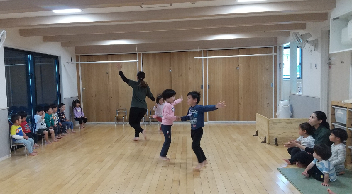 新しく入園した子どもたちは、最初は戸惑い、少し離れたところから見ていることもありましたが、少しずつ慣れてきて、今では友だちと一緒に参加する姿が増えてきました。