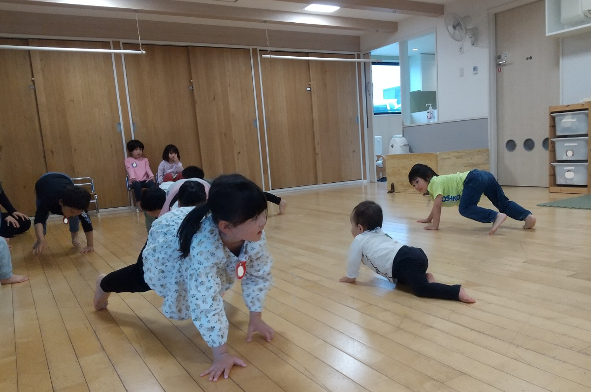 馬場どろんこ保育園では日課として毎朝、0歳児から5歳児みんなで「さくらさくらんぼリズム体操」を行っています。さくらさくらんぼリズム体操とは、ピアノの音楽に合わせて全身を使って動くことで、心と体のバランスを育てていく体操です。