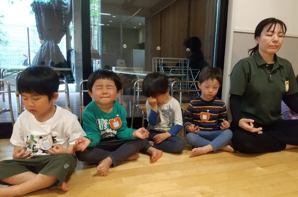 5歳児が見本となり、年下の子たちも真似をしようとあぐらをかいて一生懸命ぎゅっと目を閉じている子や、目をうっすら開けてみんなの様子を見たりする子などかわいらしい姿が毎朝見られています。