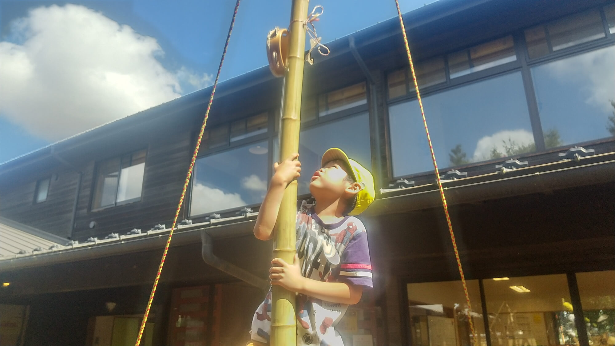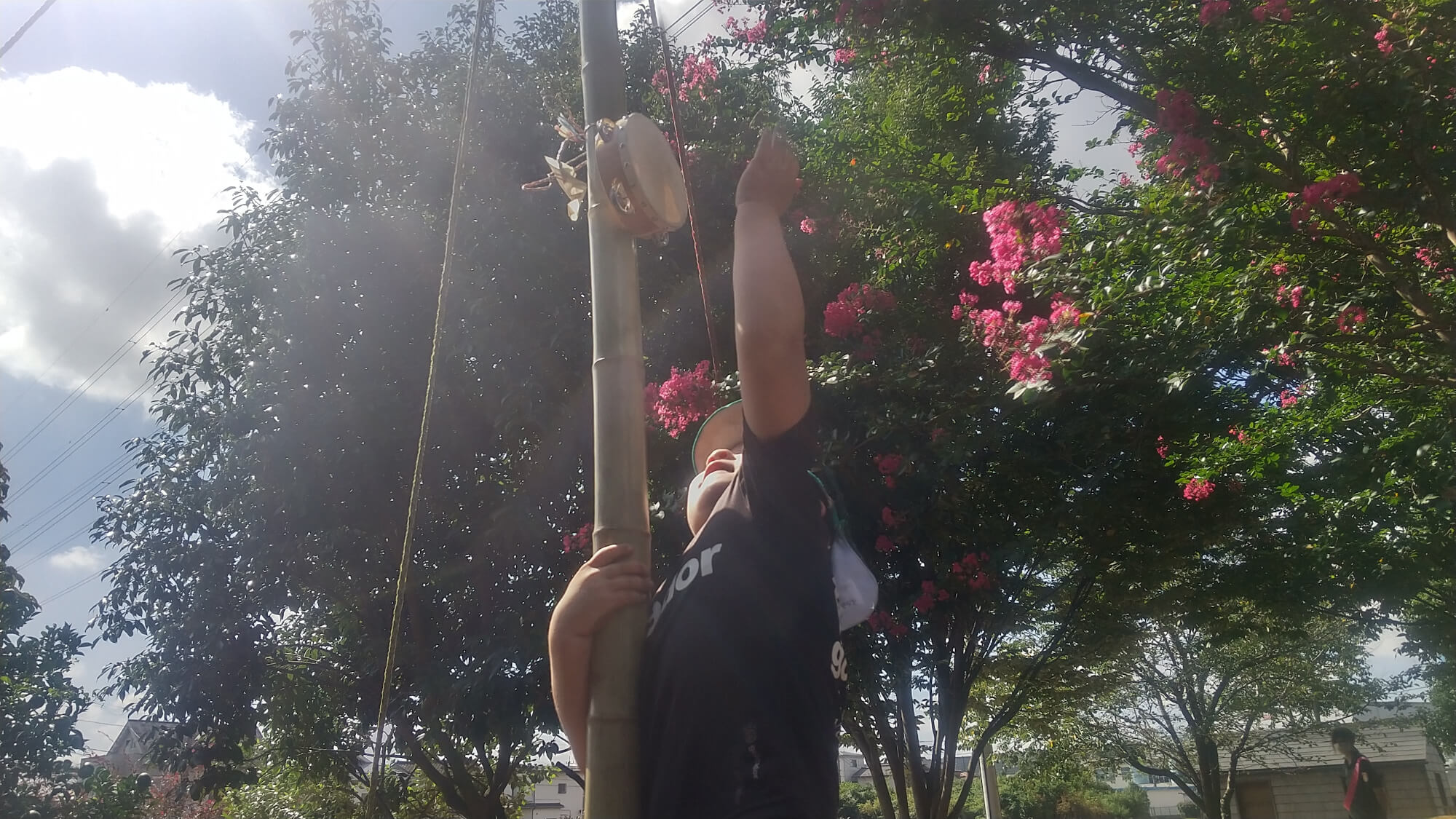 竹の上部にはタンバリンが吊るされています。それを目指して上る子の視線は熱く、その頑張る姿を見て、自然と「がんばれー!」という声援が子どもたちから送られていきます。目標に向かって頑張った子どもたちの姿は達成感であふれており、キラキラした笑顔は眩しいくらいに輝いていました。こめ組の竹のぼりは憧れや期待、葛藤を網羅した活動となっています。
