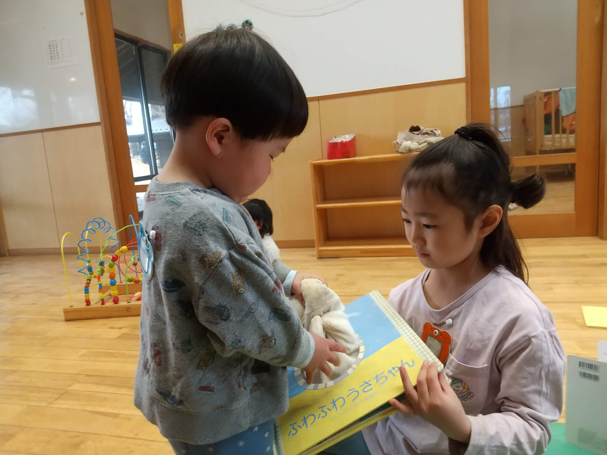 日頃から自分より小さな子たちのお世話は進んで行えるこめ組ですが、久しぶりに登園してなかなか活動に入れない子にそっと寄り添う姿や会話がなくても気持ちを汲み取って関わる優しい姿があります。子ども同士で心地よい時間を作るのがとっても上手に成長しています。