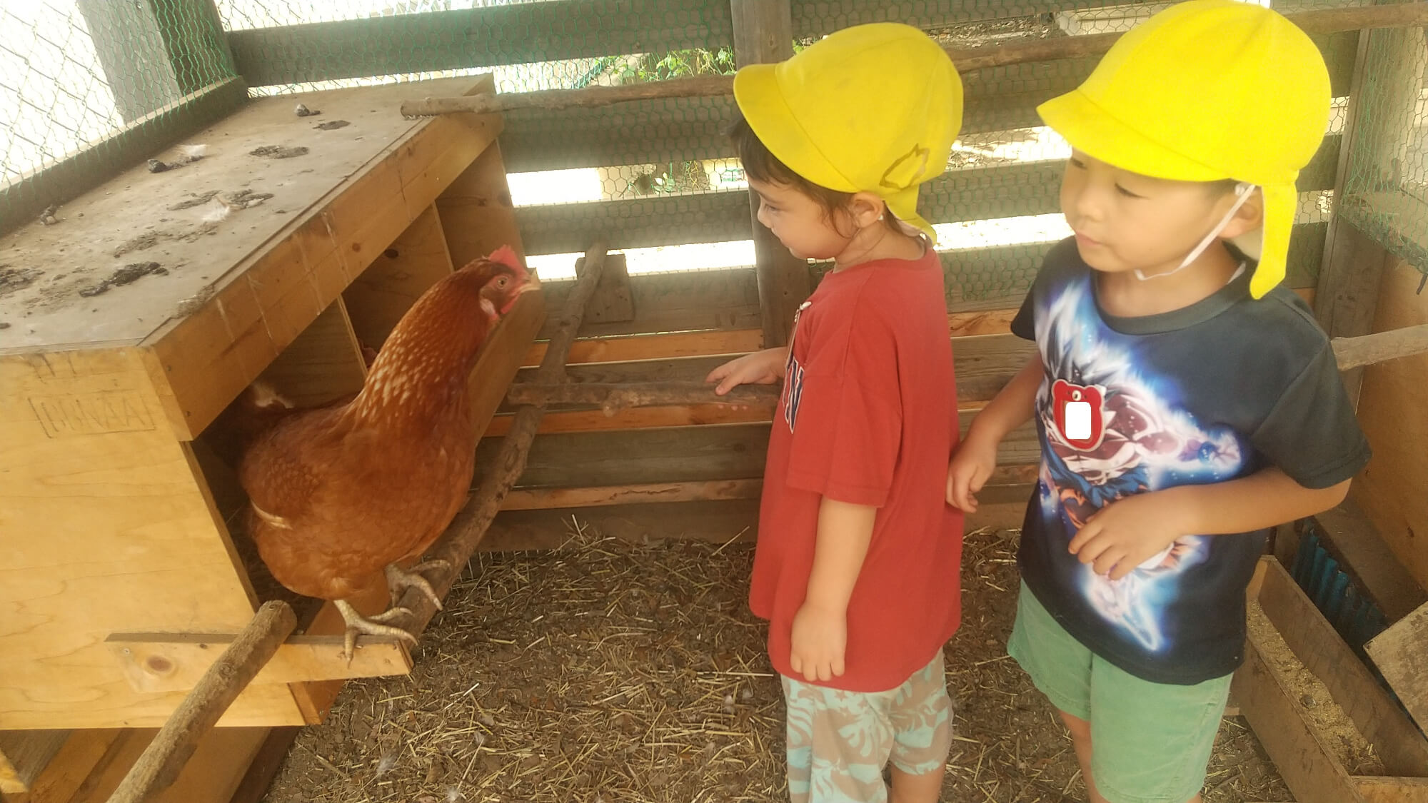 5月の終わりに保育園にやってきた鶏ですが、みんな大歓迎で迎えたものの間近で接するのが初めての生き物に戸惑う様子もありました。