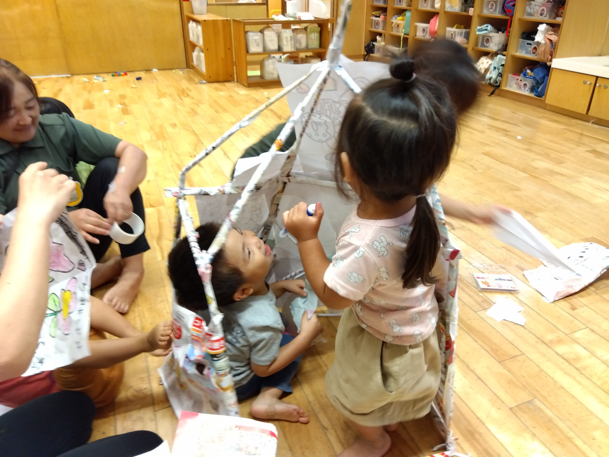何を作るかは子どもたちの発想次第。ドレスやらティピィーテントやら何ヶ所かコーナーが出来て行き、完成を目指して楽しむ姿が見られました。