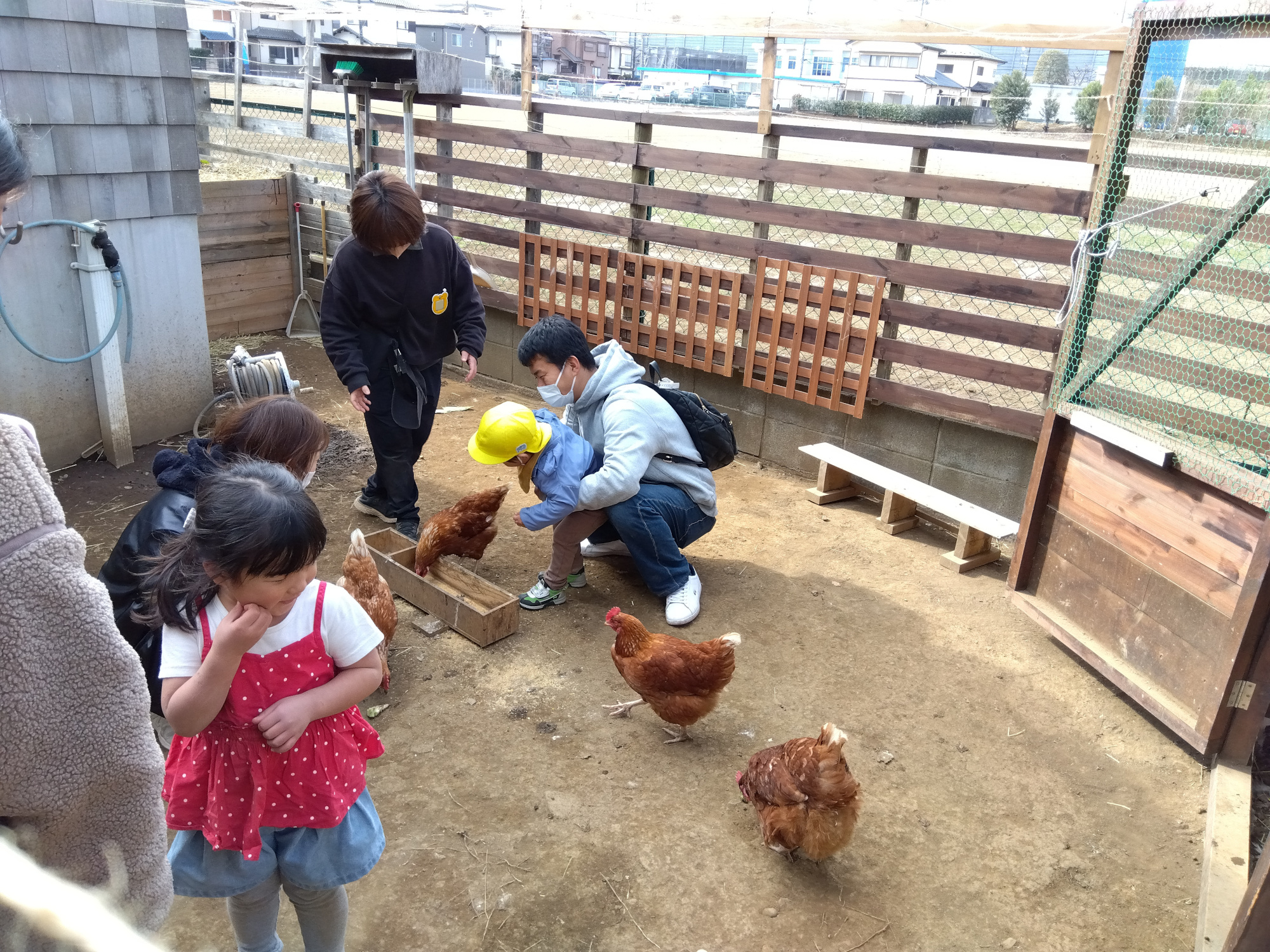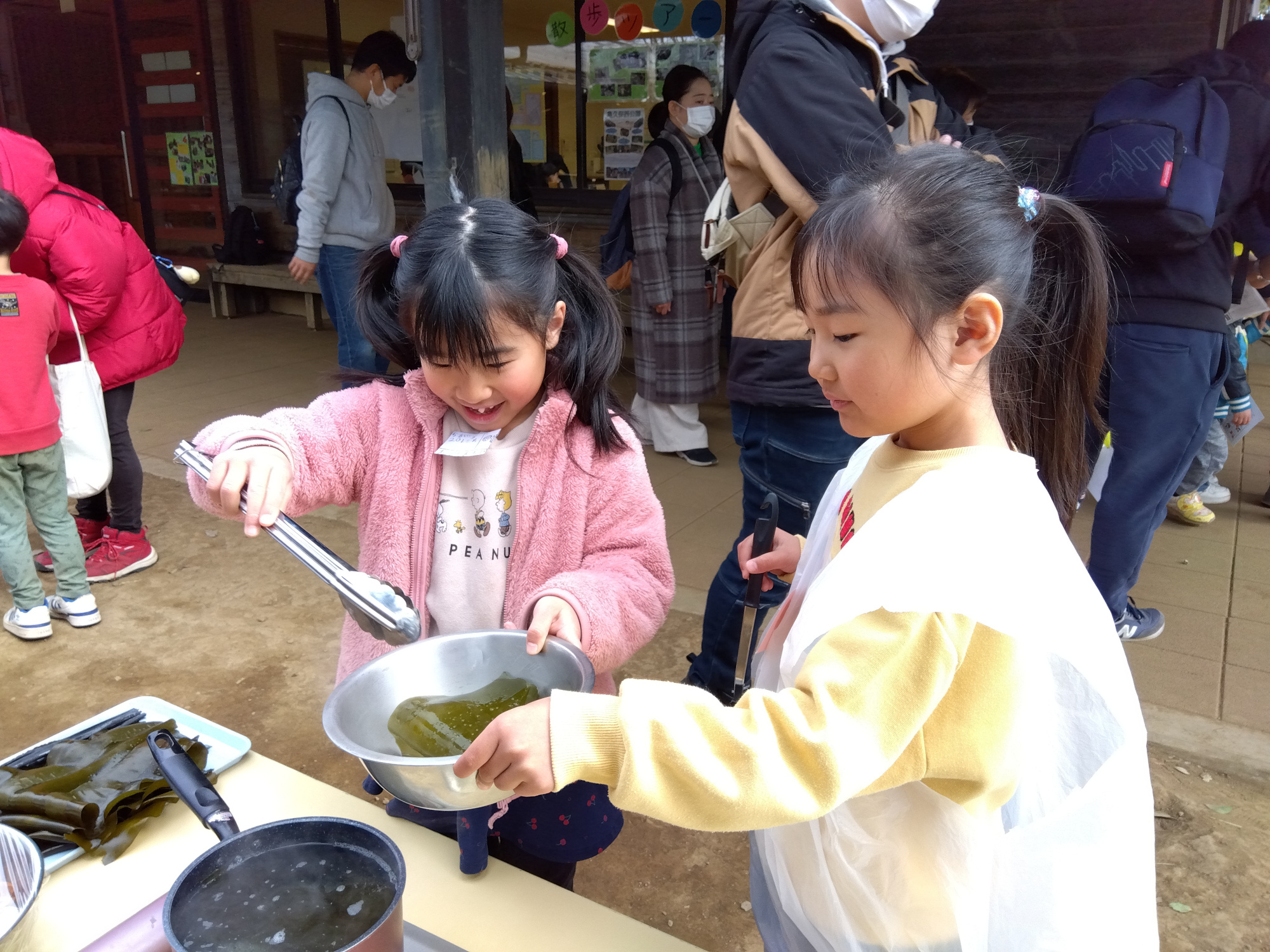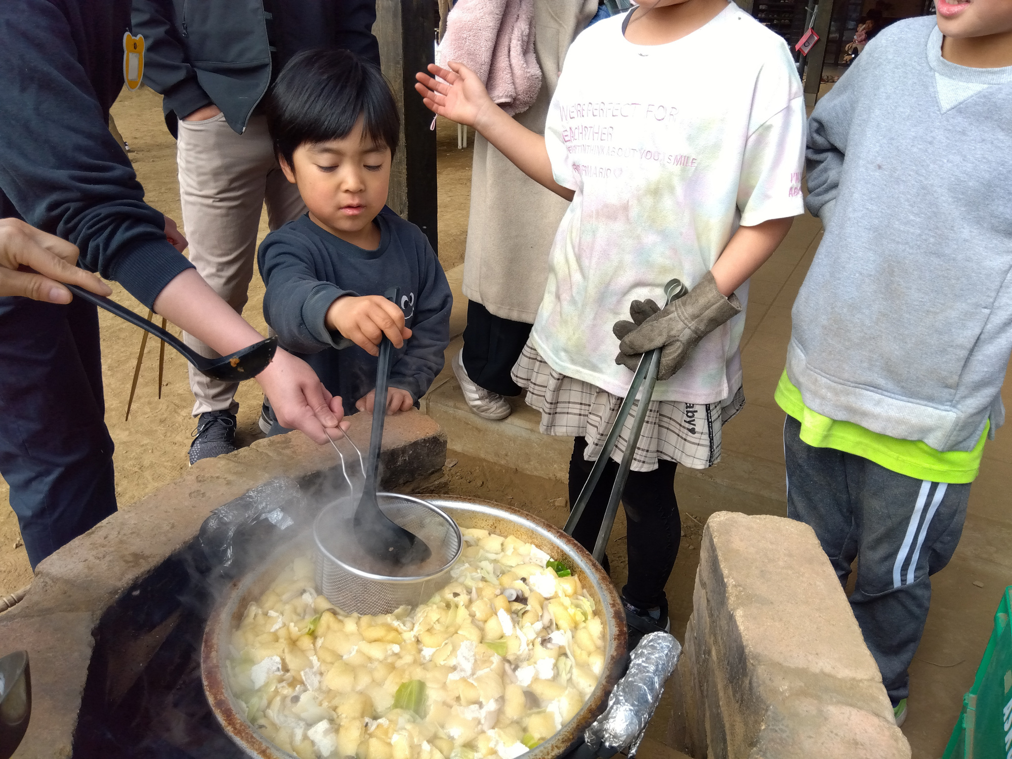 食育で年長児が行った出汁作りで「お母さんたちにも出汁を飲んでもらいたい。」と子どもたちから上がった声を形にしてふじみ野どろんこ名物のかまどで味噌汁をつくったり、鶏が大好きな子どもたちの様子がわかるえさやり体験など、子どもたちはいつも通りを安心して行えている様子でした。