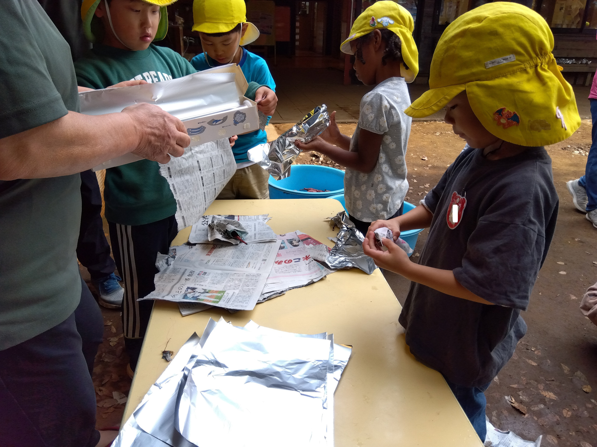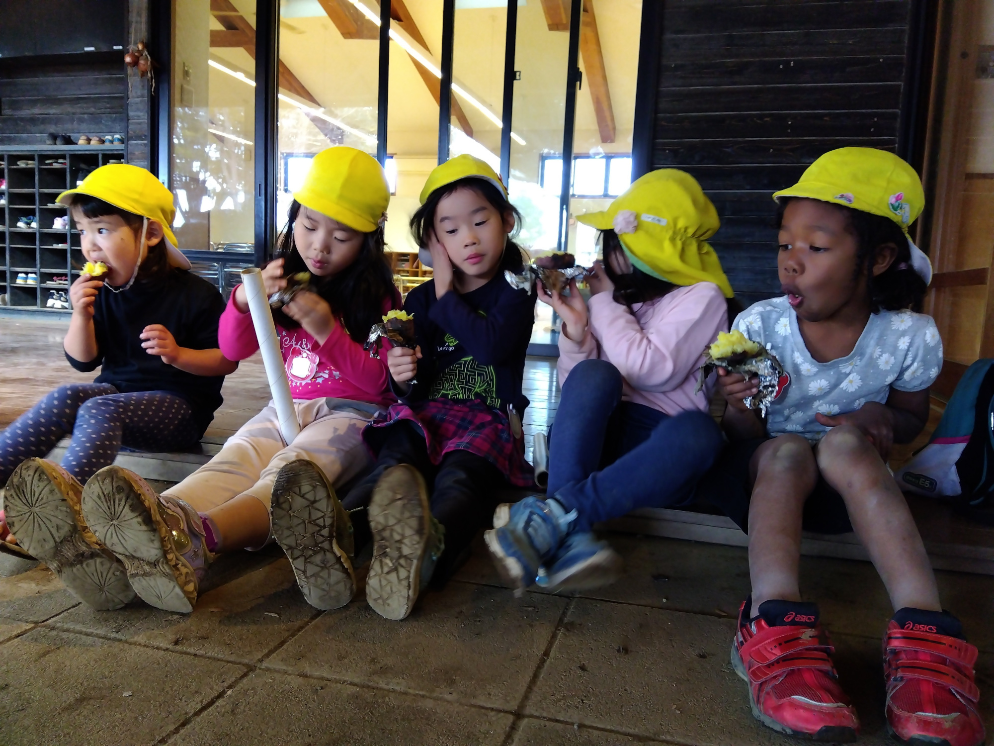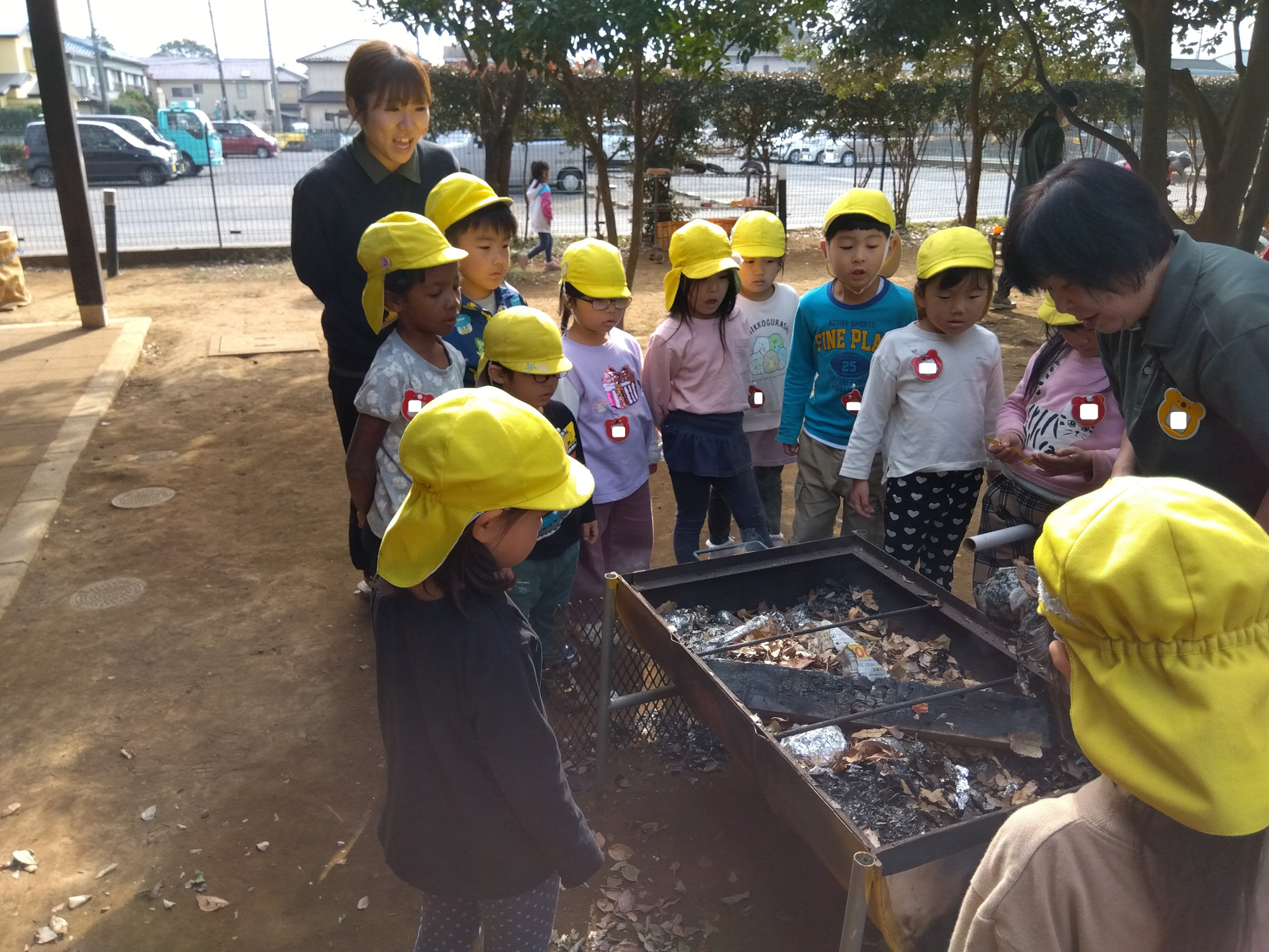 簡単には進めないのが、保育園の行事の面白い所です。おいしい焼き芋をいっぱいたべたい、大きいお芋がいいと考えるのが、子どもの思考ですね。芋を洗って濡らした新聞紙とアルミホイルで包む作業では、沢山あるさつまいもの中からとびきり大きなものを見つけて「これは○○の!」と気合十分な子もいました。次々ちょうどいい焼き芋ができあがりおいしそうに頬張る仲間を横目に、「○○のはまだ焼けないの?」と待ちきれない様子でした。結局、待つことが出来ずに焼きあがった焼き芋を食べて、満足そうな笑顔を見ることが出来ましたが、きっとこの行事で丁度良い大きさを知った事と思います。