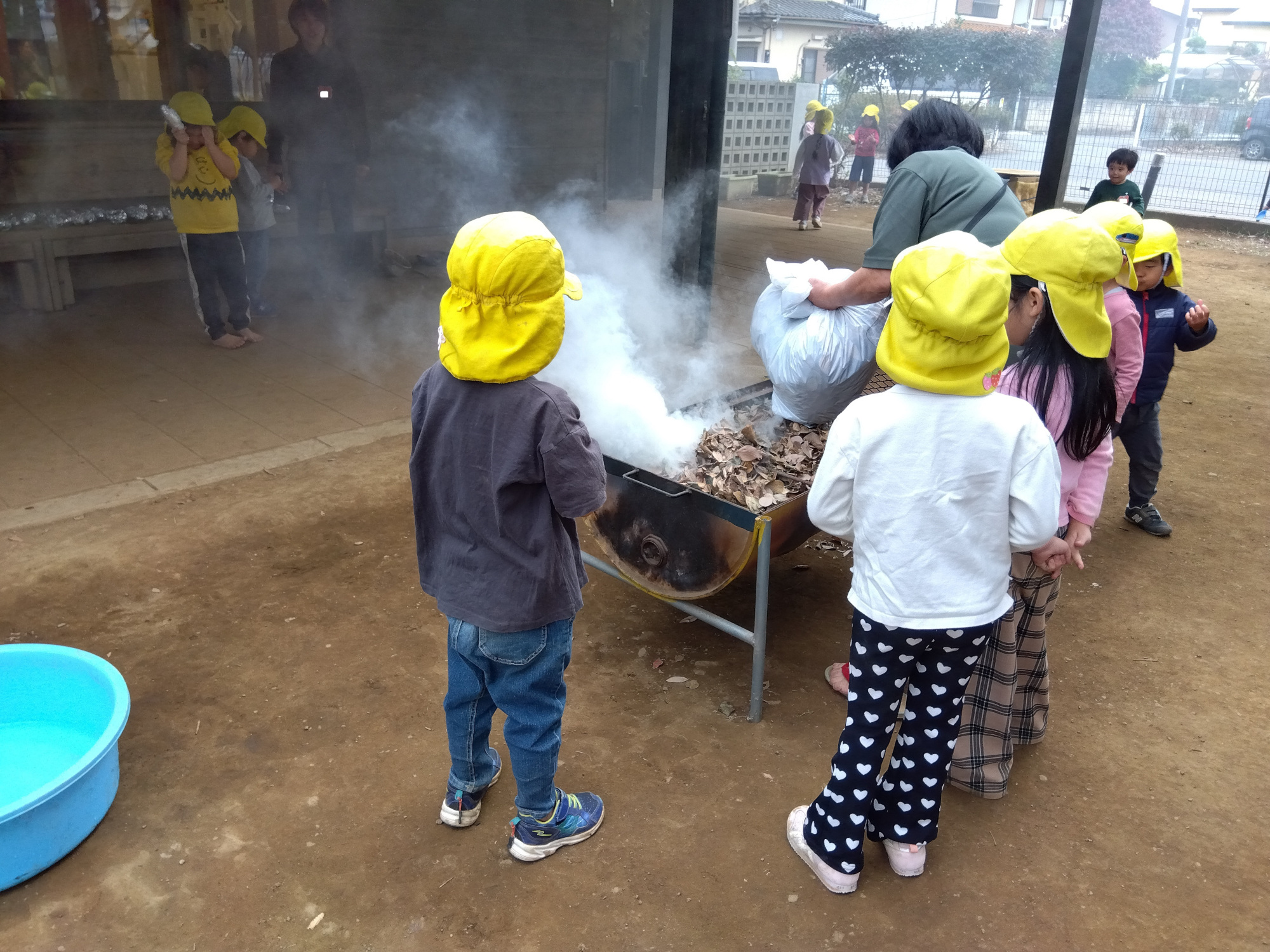毎年秋から冬に変わるこの時期の恒例行事となっている焼き芋です。園庭の木々から落ちた、落ち葉を利用し、年長児中心に活動します。年長児は去年の様子を思い出しながら、自分より小さな子たちに準備の仕方を教えてくれます。