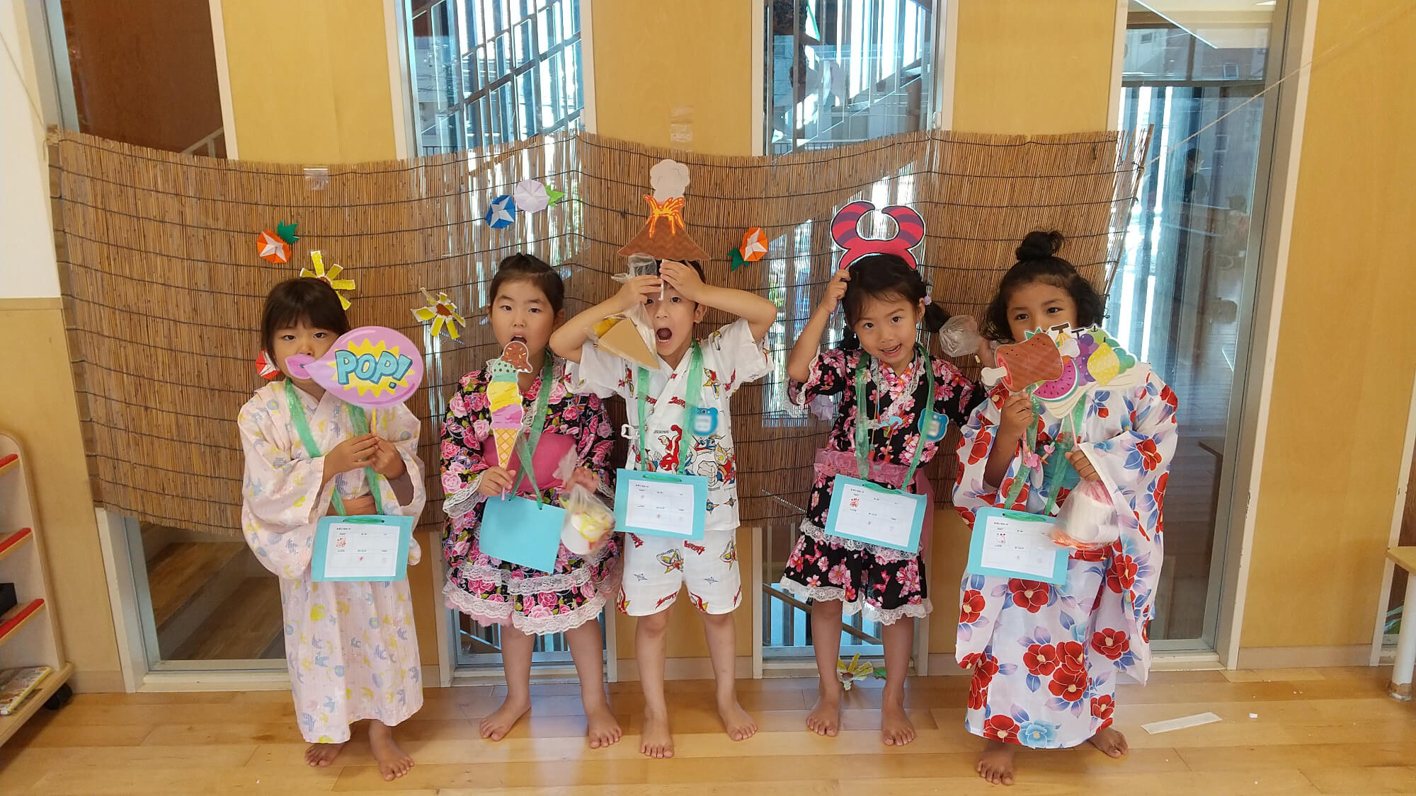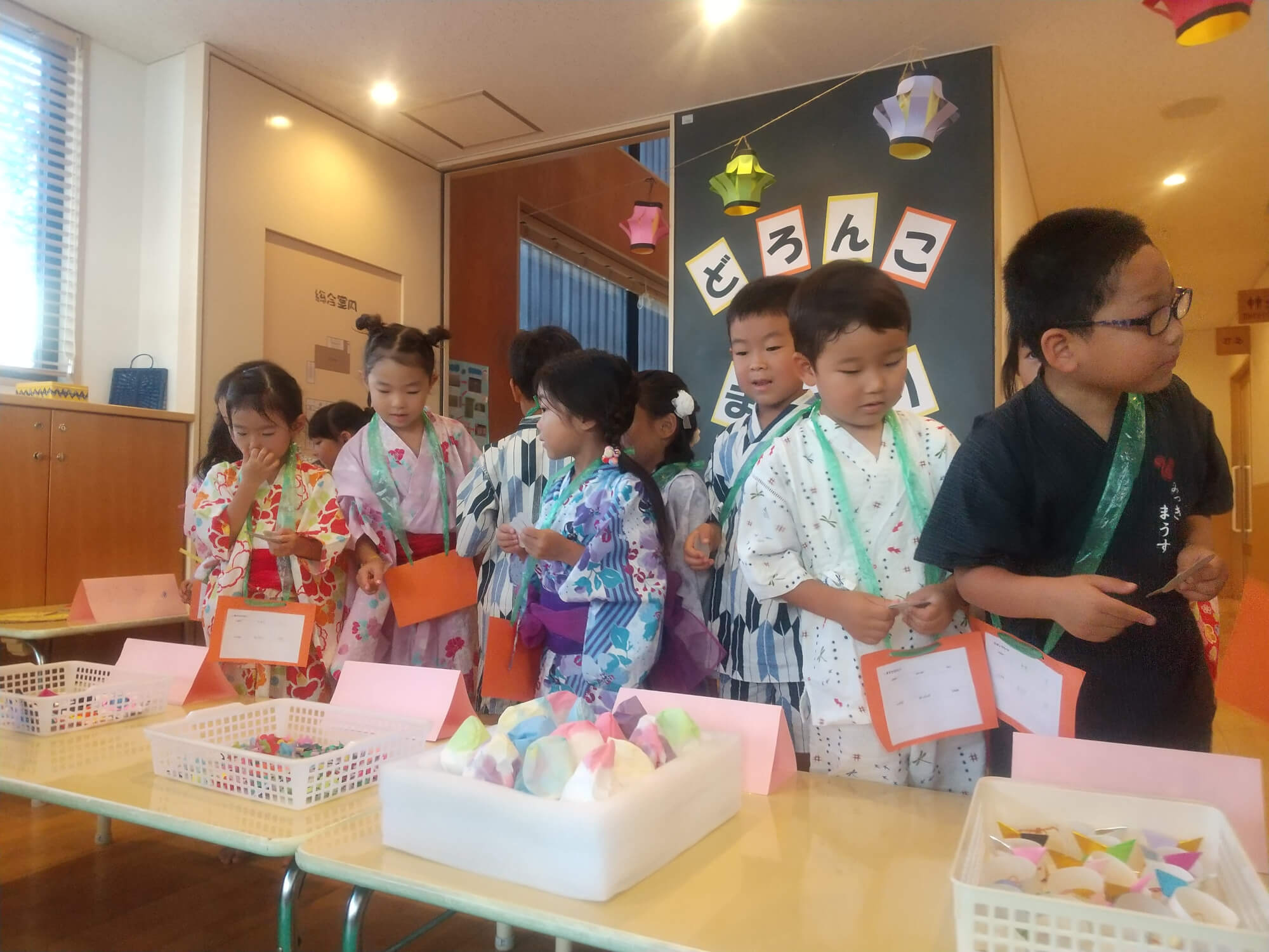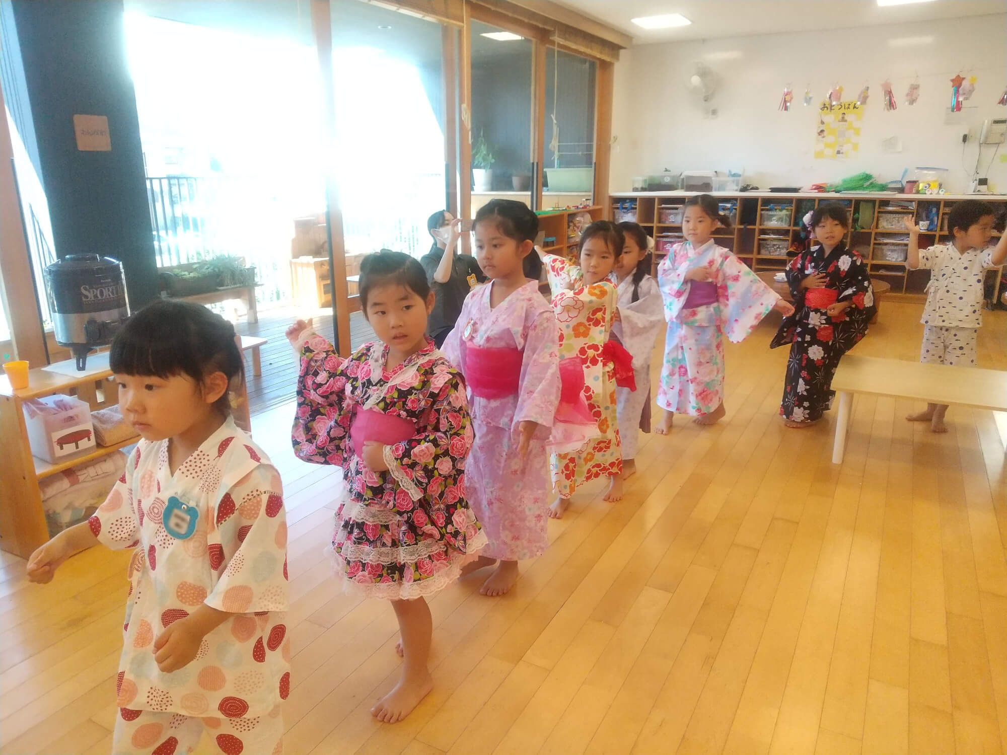 可愛らしい浴衣を着て、子どもたちはすっかりお祭りモードです。「今日のお祭りをずっと楽しみにしていたよ!」と話す児もおり、子どもたちの素直な気持ちに心が温かくなりました。皆で盆踊りを踊って、楽しいお祭りのスタートです。