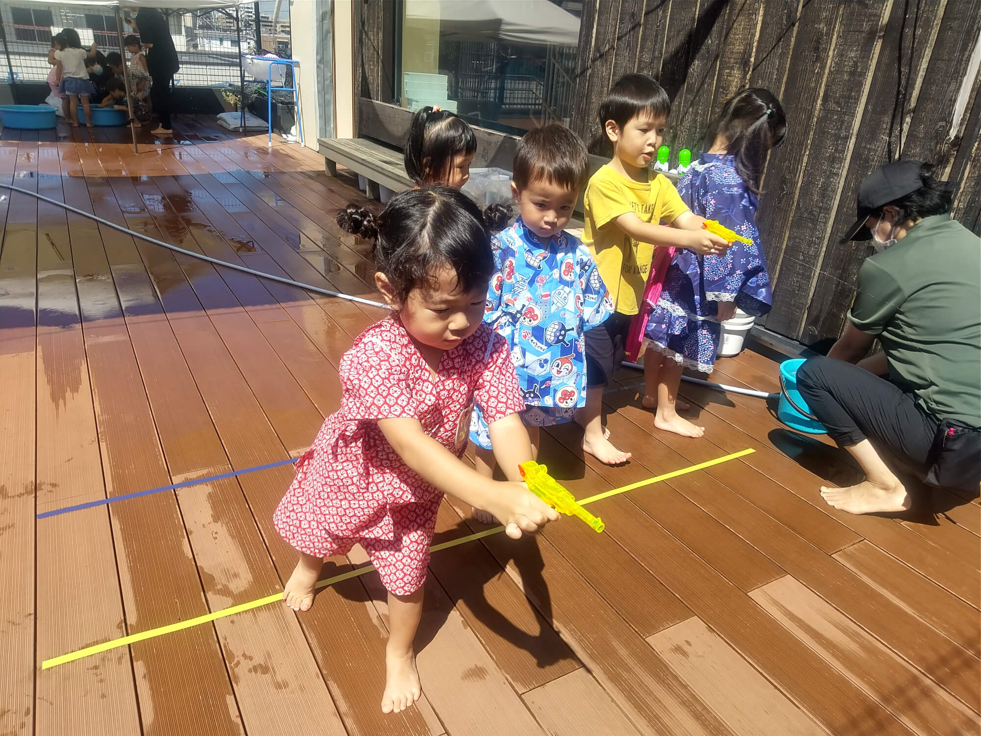 屋上では水鉄砲を使って射的体験です。子どもたちの表情は真剣そのものでした。真剣な眼差しに、職員も息を飲んで応援しました。