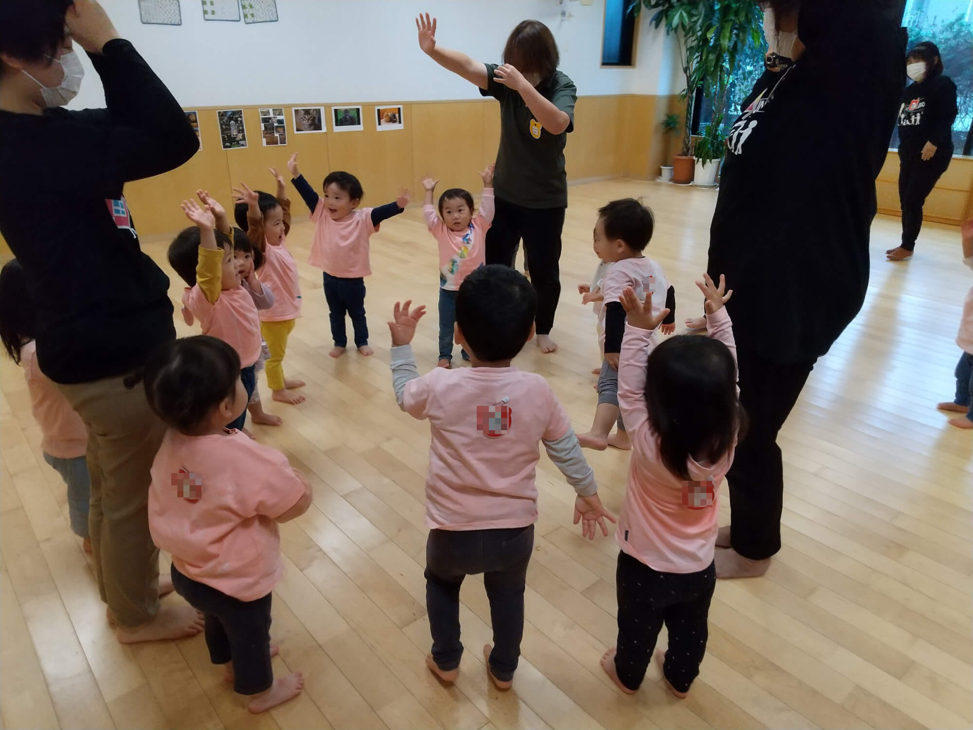 乳児クラスの様子です。準備体操を兼ねて普段の生活で取り組んでいる「さくらさくらんぼリズム」を行いました。何種類もの音楽を聞き分けて、リズムに合わせて体を動かしています。