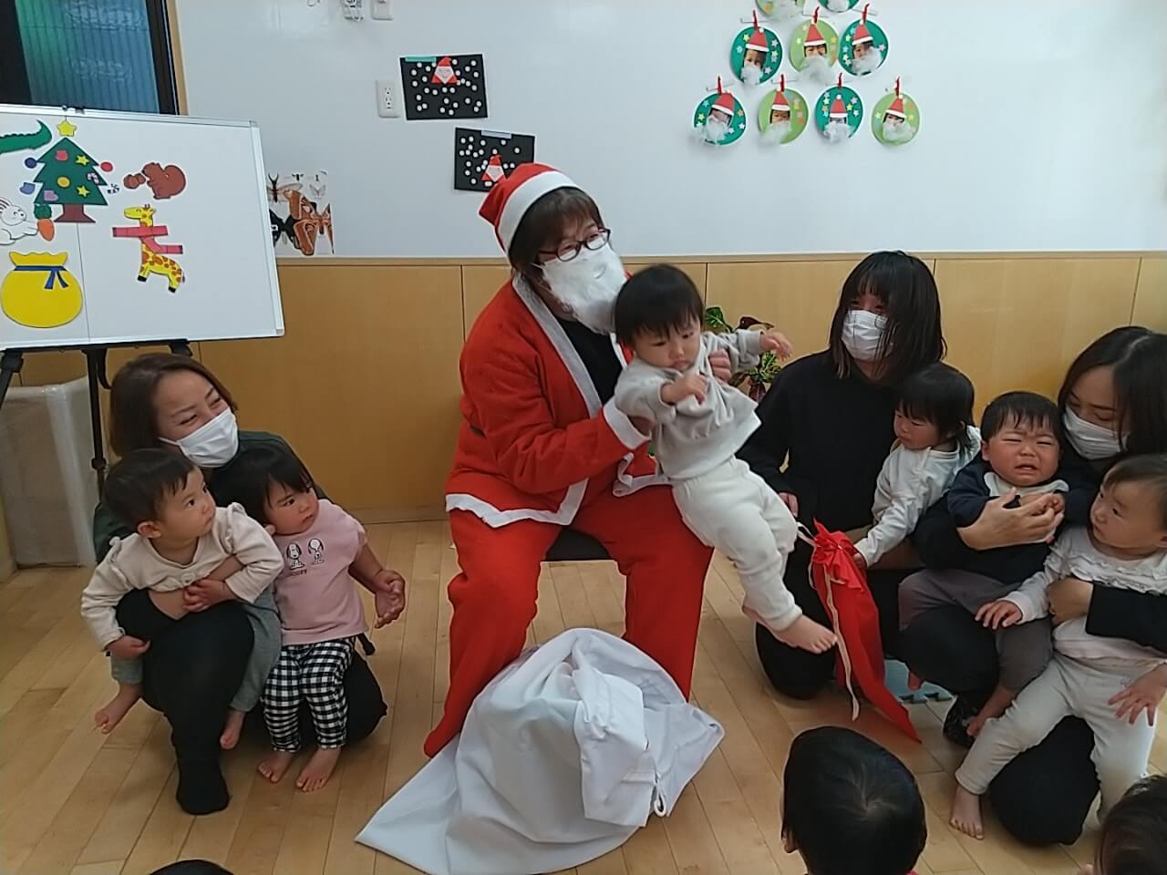 はじめてのサンタクロースにあわ組は緊張していて、集合写真ではなるべくサンタさんから離れようと保育者の陰に隠れていましたが、『プレゼントだけはもらいたい』と思ったのか、遠くから手を伸ばして受け取ろうとしていました。