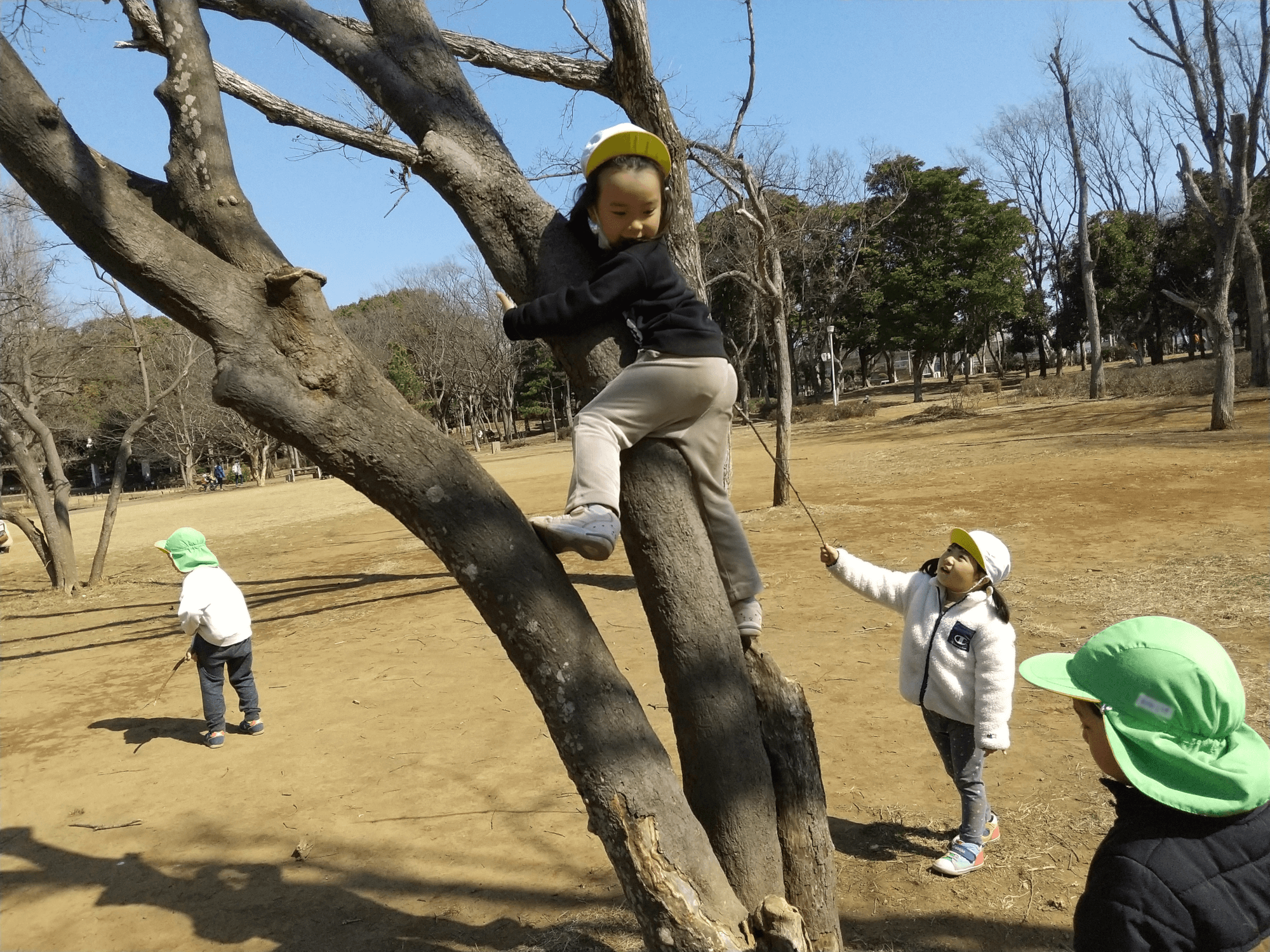 公園では木登りや探索遊び、追いかけっこなど元気いっぱい体を動かして遊んでいます。たくさん遊んだ後は給食を心待ちにしながら頑張って歩いています。
