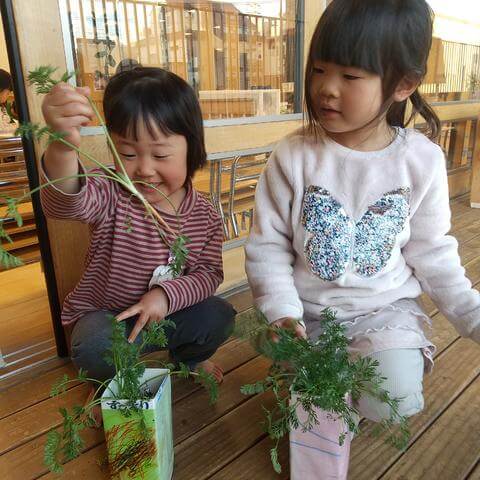 広い園庭や近隣に畑などがないため、プランターや牛乳パック、ビニール袋などを使って野菜を育てています。人参の葉っぱや大根を収穫して給食のお味噌汁に入れてもらいました。味噌汁のお味噌はこめ組の手作り味噌でした。