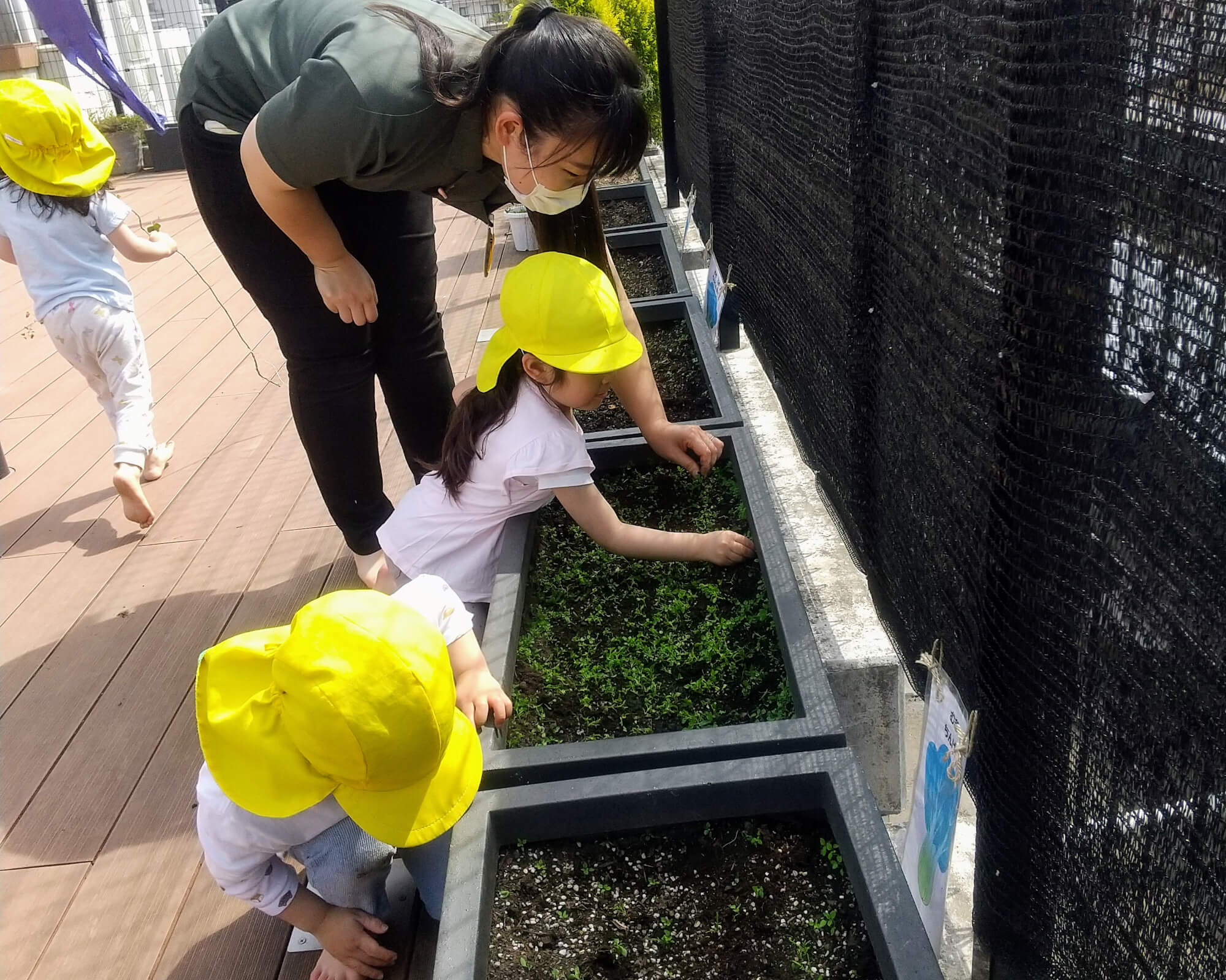 屋上にはプランターがあり、季節の野菜や花を育てています。この日はだいず組のみんなで、雑草を抜いたり、カブの収穫をしたりしました。