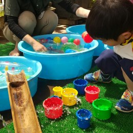 4歳児、5歳児になると、遊びもダイナミックになります。友だちと豪快に水をかけあったり、泳ぎの練習をしたりと、思い思いに楽しんでいます。