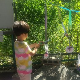 最初は顔に水がかかり、驚いて泣いてしまうこともありましたが少しずつ慣れ、満喫できるようになってきました。