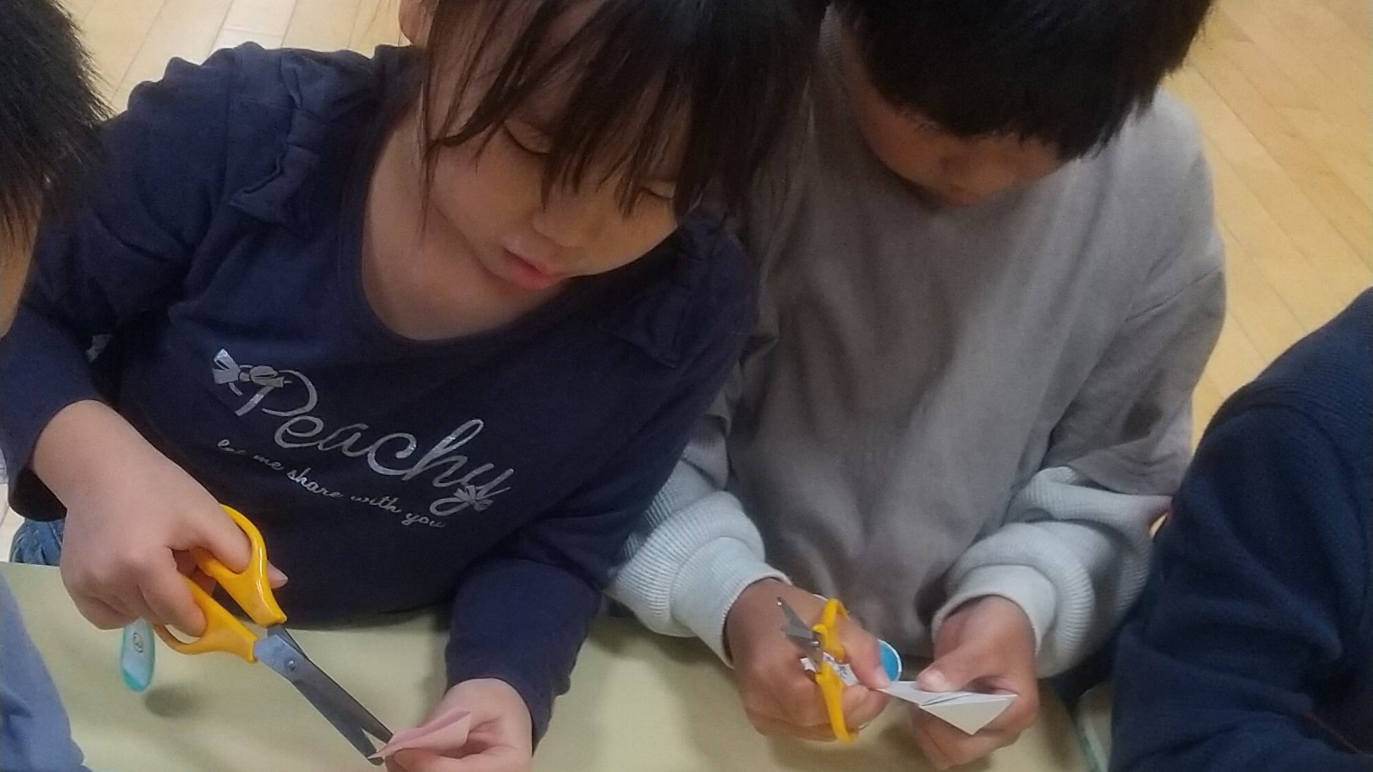 実際に子どもたちも切り絵に挑戦しました。折り重ねた紙に少し苦戦をしましたが、慎重に切り進めていた子どもたちです。