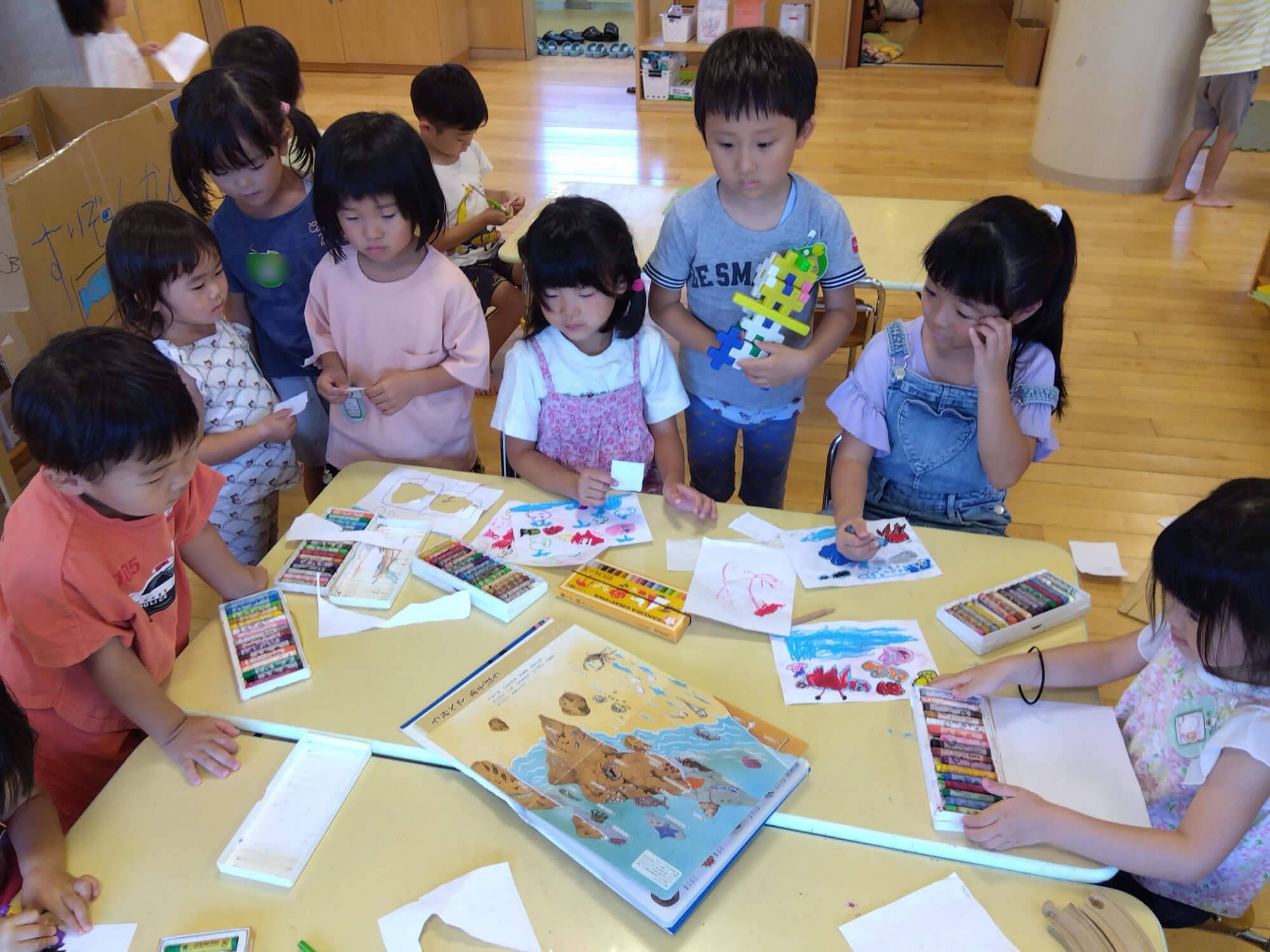5歳児が中心となり、図鑑を持ってきて写真を見ながら絵を描き始めます。