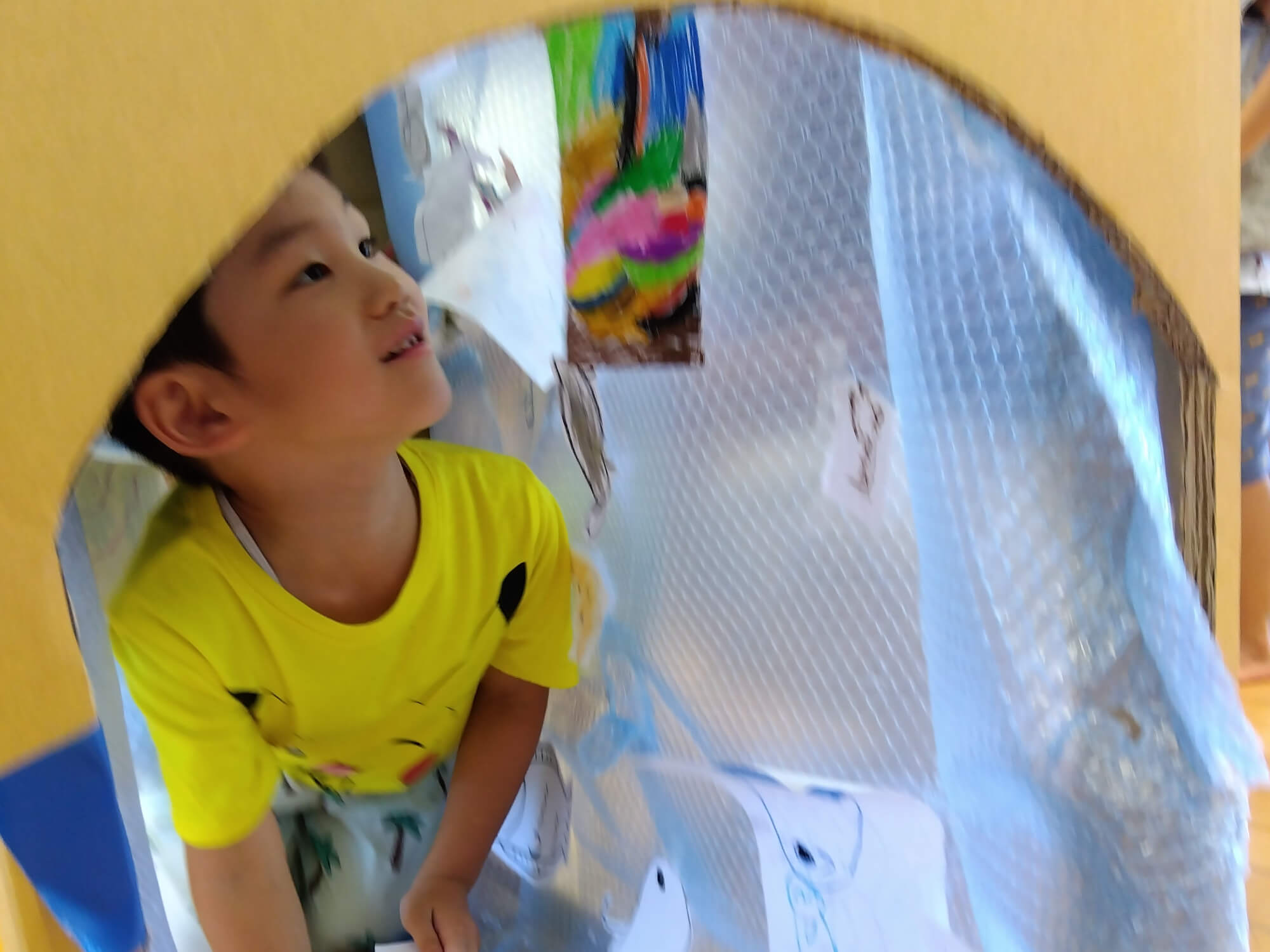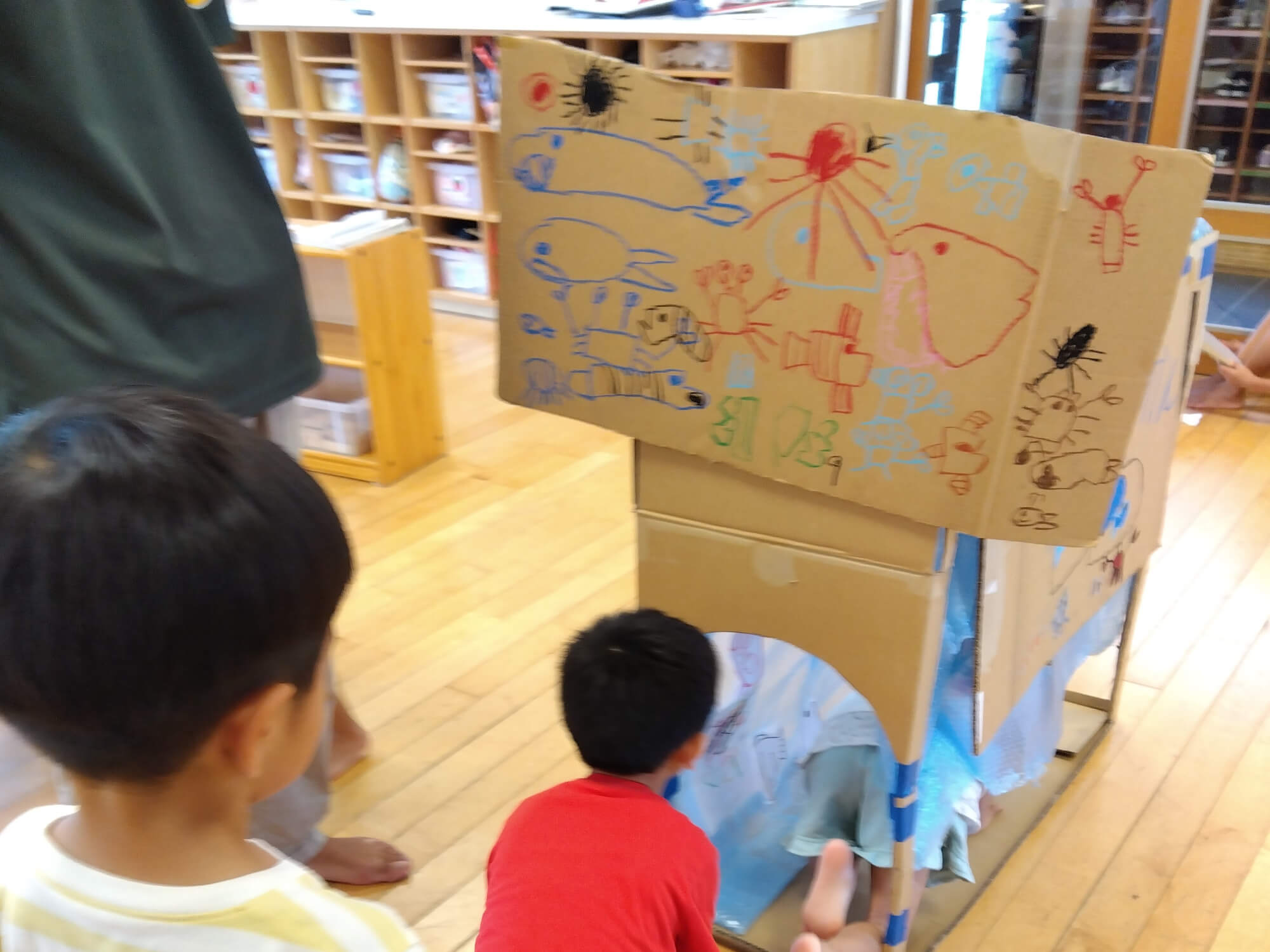 そこで、ちょうど長方形の大きめの段ボールを見つけた保育者が「この段ボールで水族館のトンネルを作れるかも?」と思い、子どもたちに提案をすると「それ、いいね」とさっそく水族館作りが始まりました。