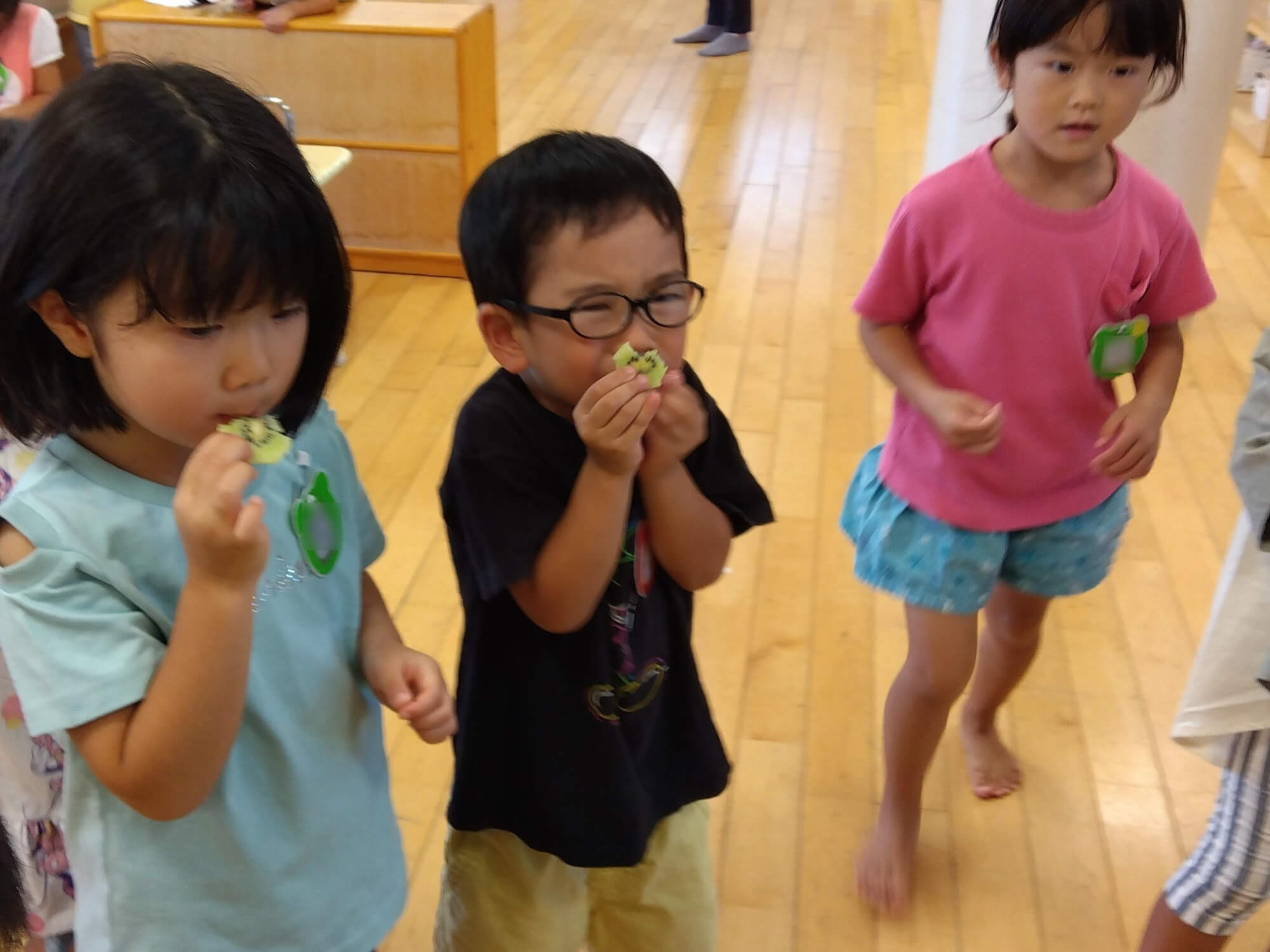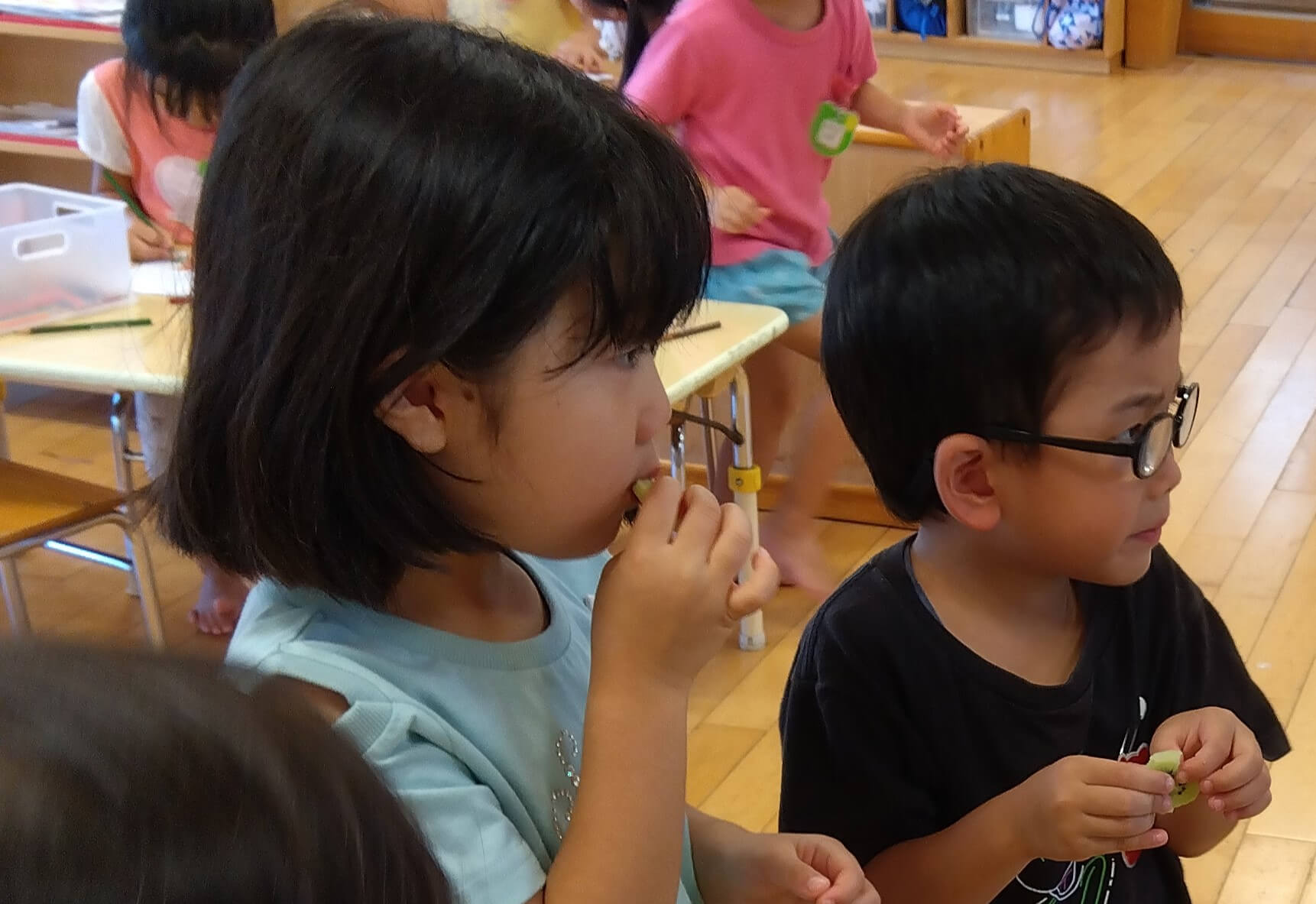 完熟して食べ頃になったら、冷やしてみんなで食べました。手に取ってすぐに食べた子たちの反応は「あまい」という子もいれば「すっぱい」という子もいて、さまざまです。>その様子を見ていた子は手に取っては見たものの、食べるのにドキドキして周りの友だちの反応を待っている子もいました。
