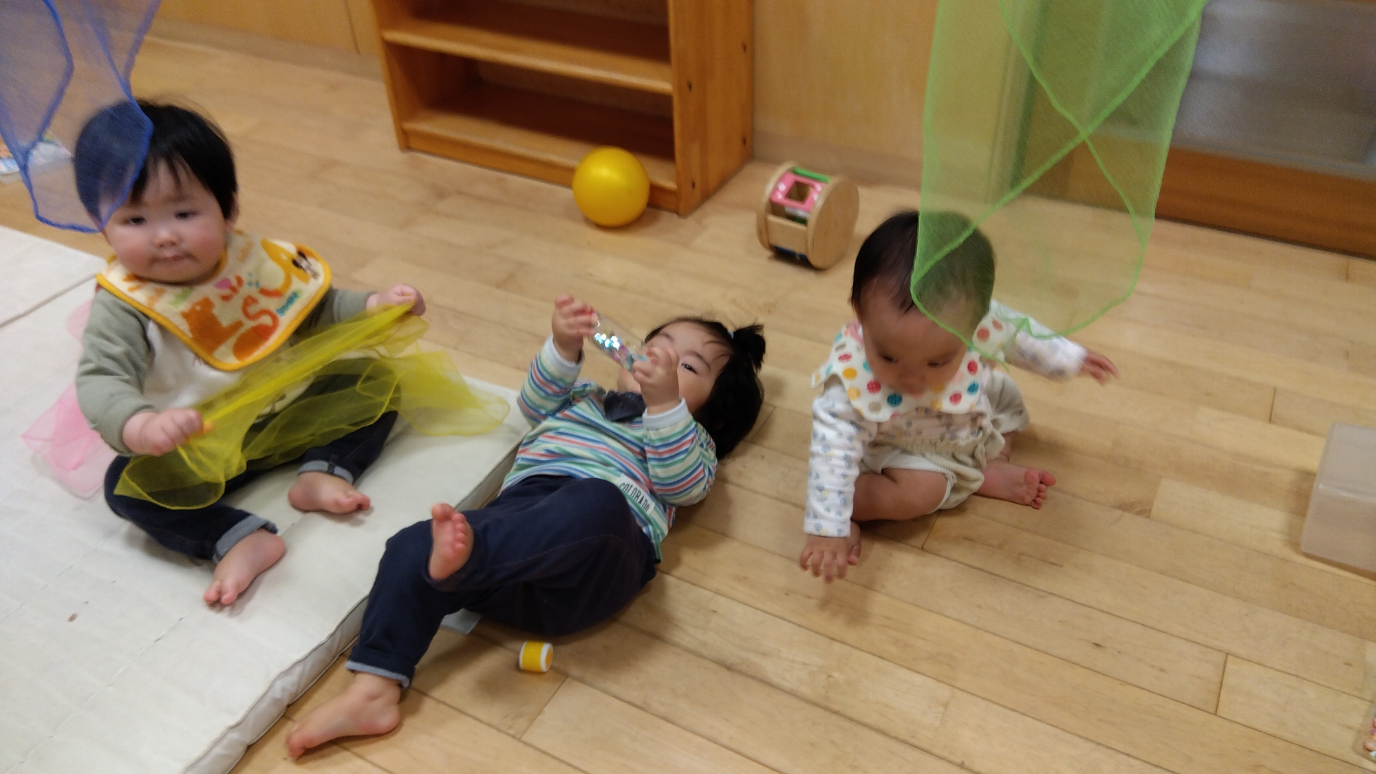 カラーシフォン布で遊んでいる様子です。カラフルな色に興味を示し、ゆらゆらと揺れる感触を楽しんでいました。見て楽しい、触って楽しい活動をこれからも多く取り入れていきたいと思います。