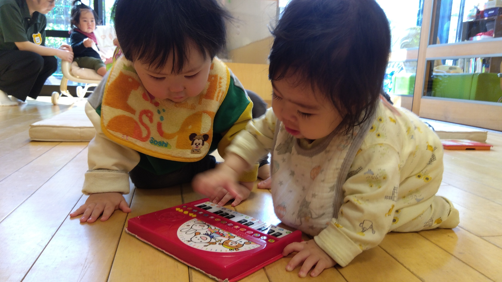 お友達にも少しずつ興味を示し、同じ玩具に手を伸ばしたり、友達同士で顔を見合わせて笑い合ったりと微笑ましい姿が見られています。