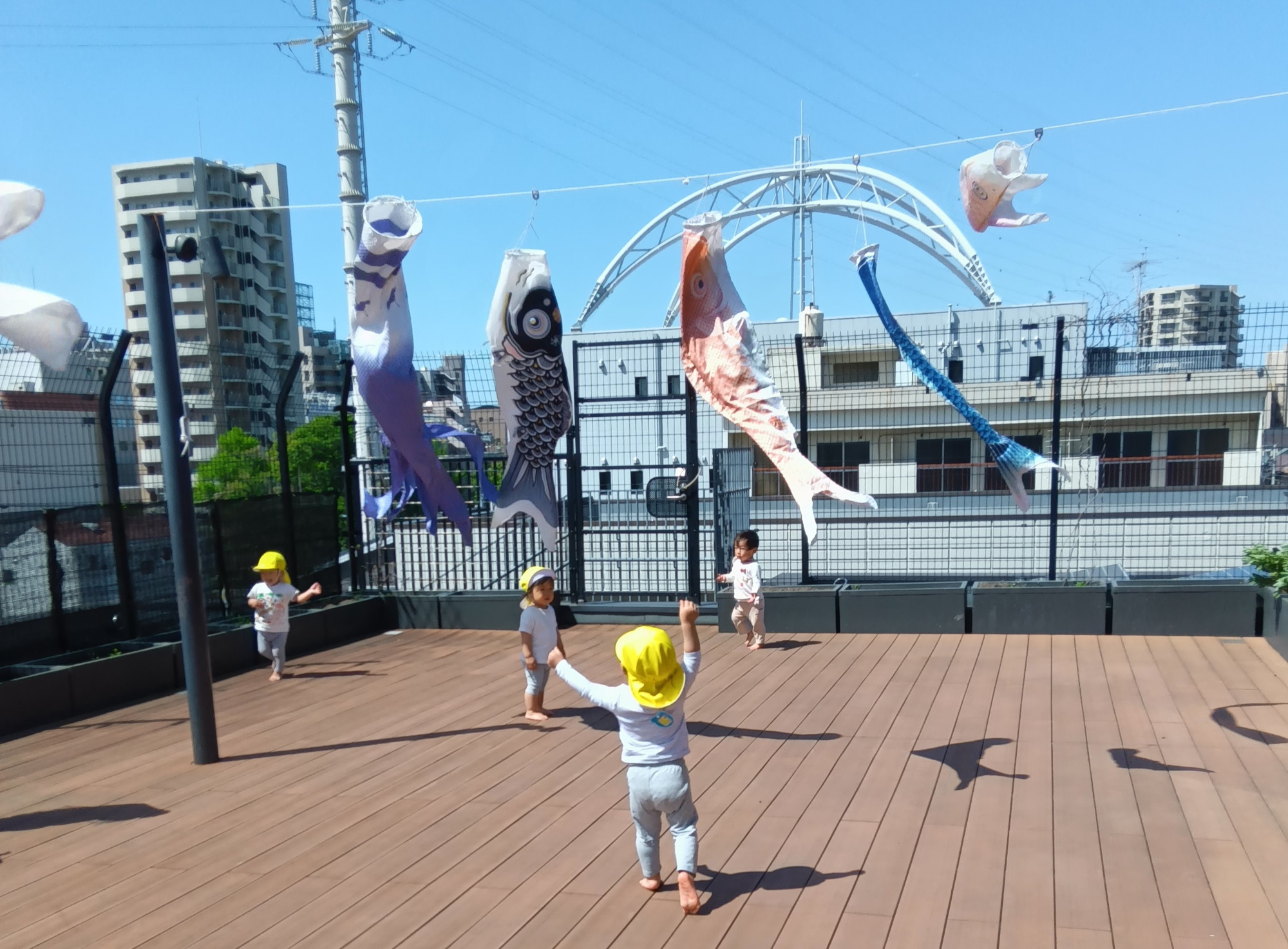 幼児クラスの子どもたちからは「今日もこいのぼり見に屋上行こうよ」という声が毎日ありました。保育者が「この黒い大きい鯉はなんでしょうか。ヒント、歌にも出てきます」とクイズを出すと「お父さん」「真鯉」としっかり答えが出ていました。