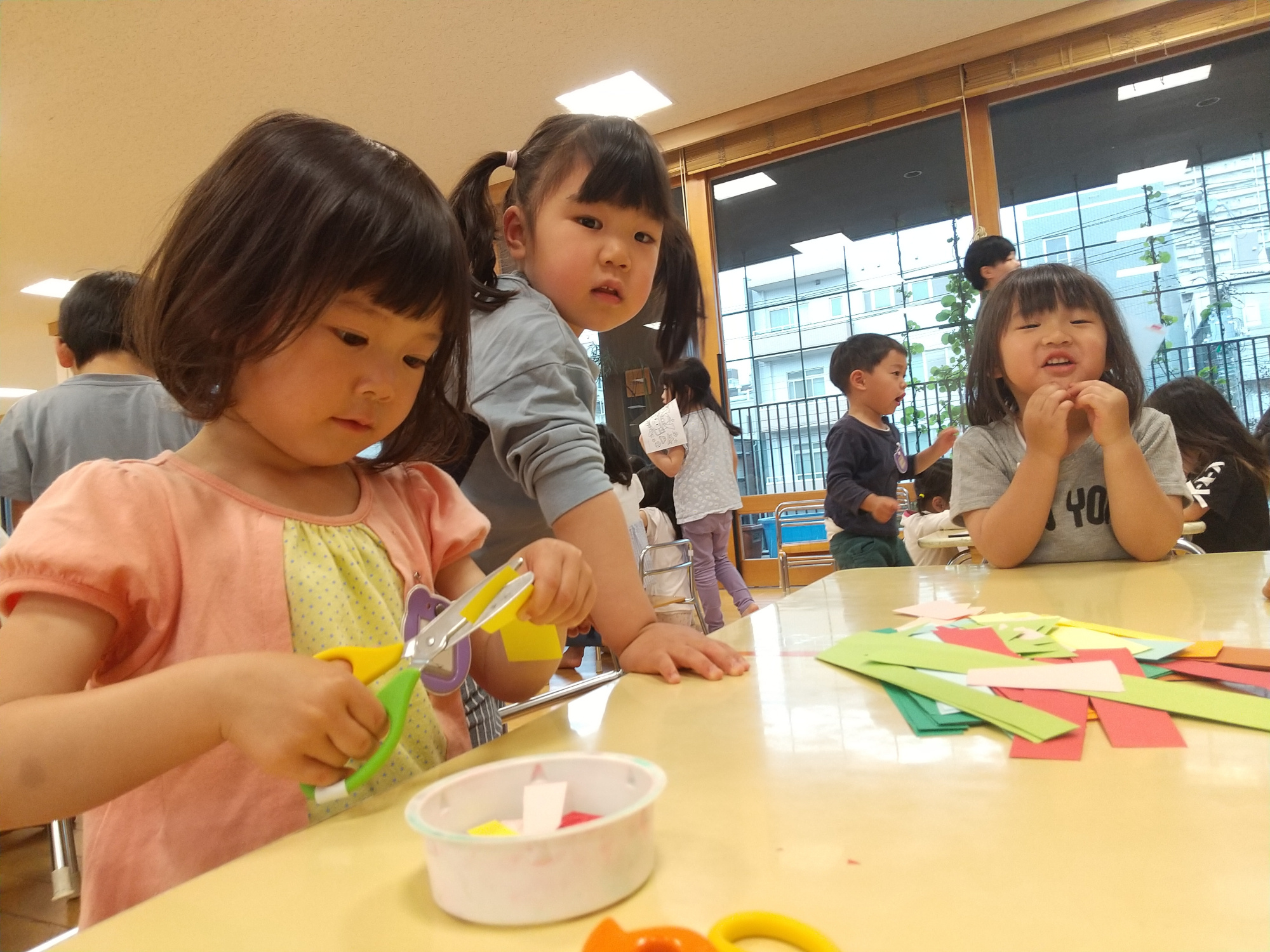 幼児クラスは、模造紙に絵の具と筆で色を付け、はさみで切った鱗をのりで貼りつけた大きな鯉のぼりを合作しました。鱗を切る際には、3歳児は早く切りたいのに焦って上手く切れずもどかしい様子で、はさみを思い通りに使うことができるようになった4歳児はもっとたくさんやりたいと何枚も切っていました。5歳児は「大きさが揃うように切る」「三角とかに切っても面白そう」と自分なりに考えながら切ることを楽しんでいました。