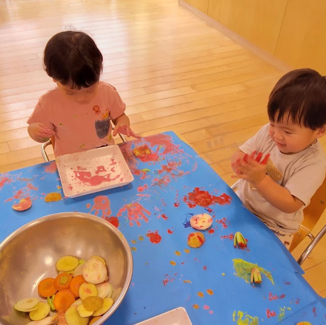 野菜ごとに違う形のスタンプになったり、手についた絵の具で手形スタンプをしたりして感触を楽しんでいます。最後には水を張ったタライで手を洗い、色水遊びに発展していました。