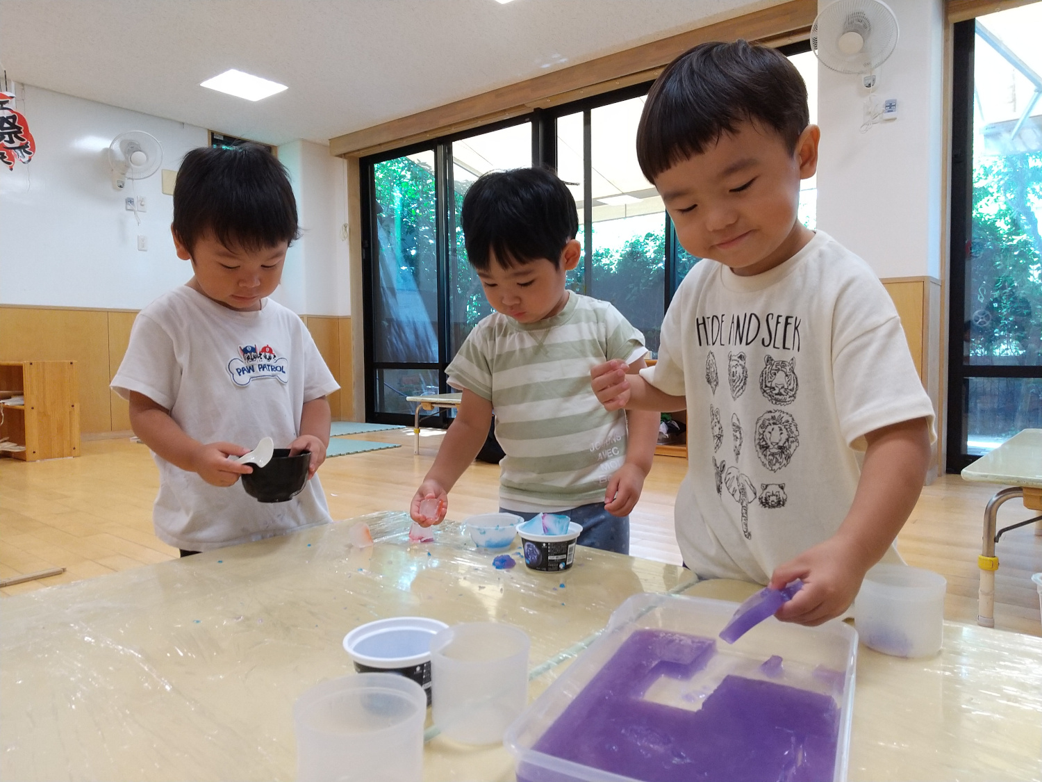 暑い日がまだまだ続きますが、船橋どろんこ保育園ではプール活動以外にも、暑い夏にはもってこいの感触遊びや制作活動を行っています。