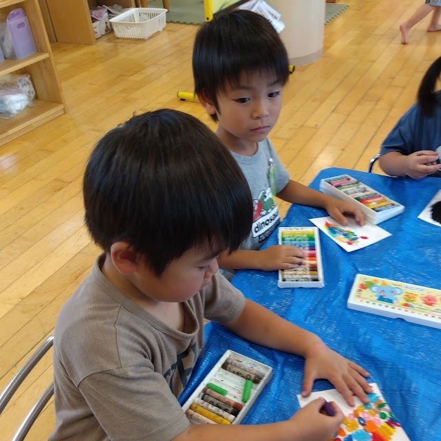 下地のカラフルな色が出てくると「おぉ!」と驚き、要領が分かると二枚、三枚と行う子もいました。様々な技法で制作物を作ることに挑戦しています。