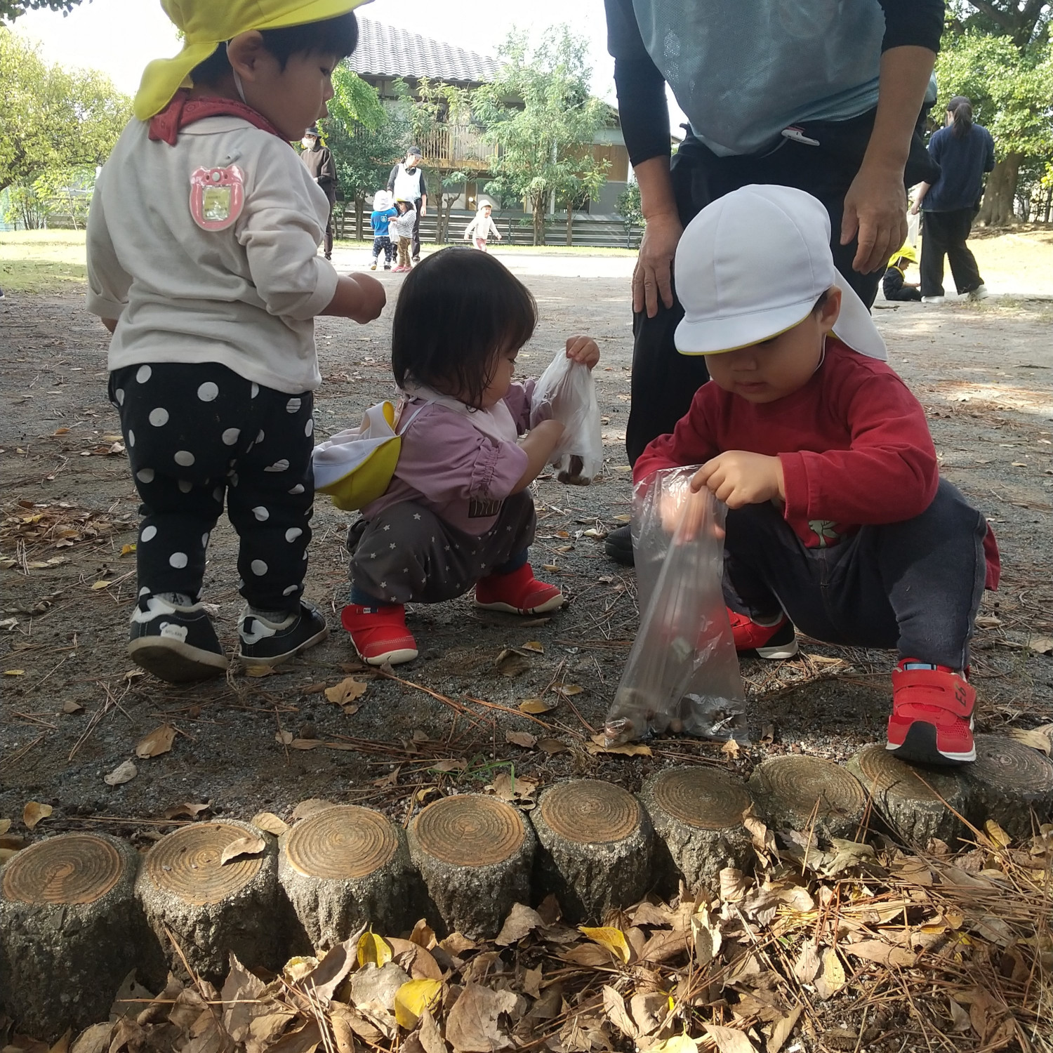 どんぐりやまつぼっくりがたくさん落ちていたので、みんな目を輝かせながら大事に宝物を入れるかのように袋に集めてよく遊んでいました。