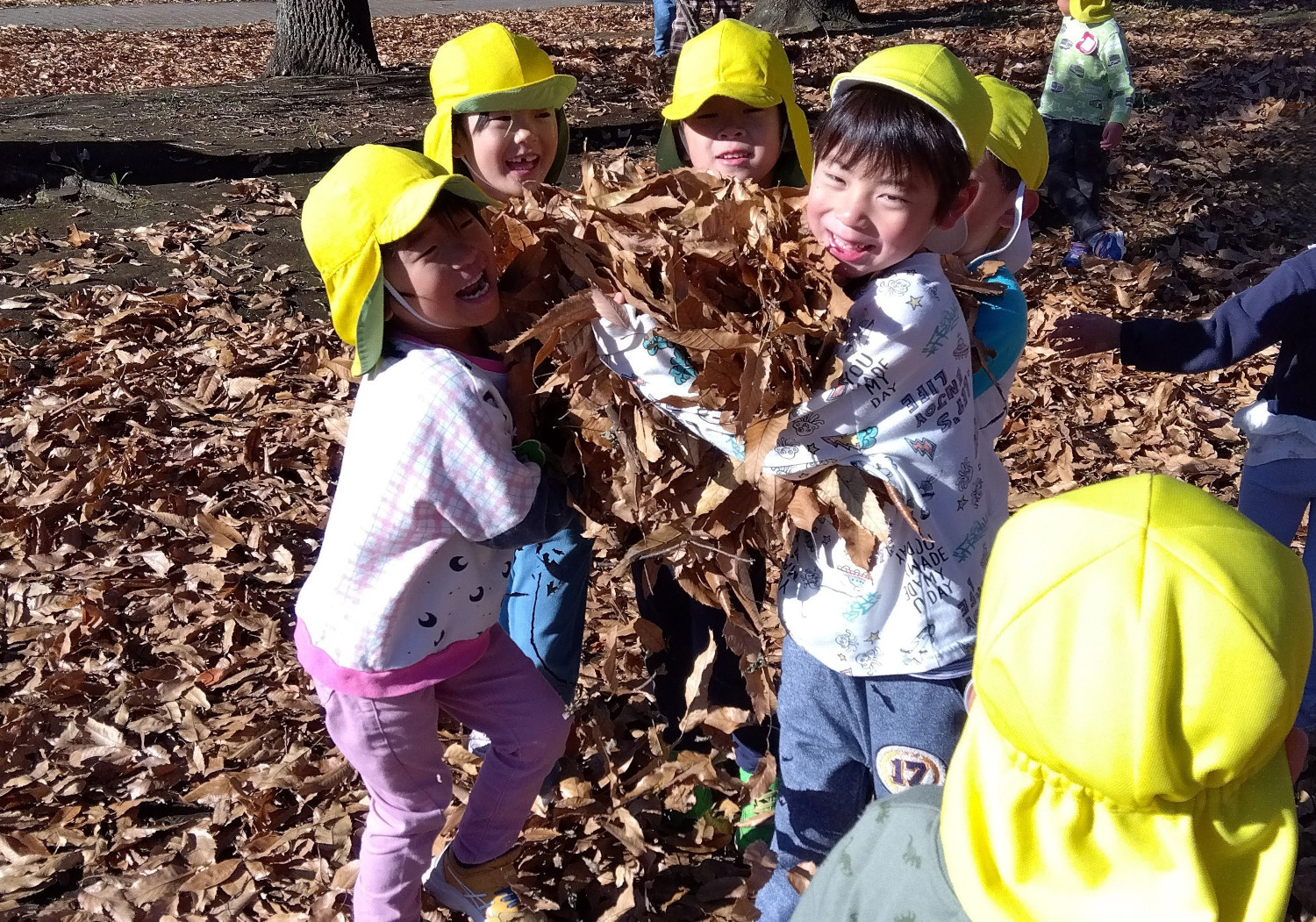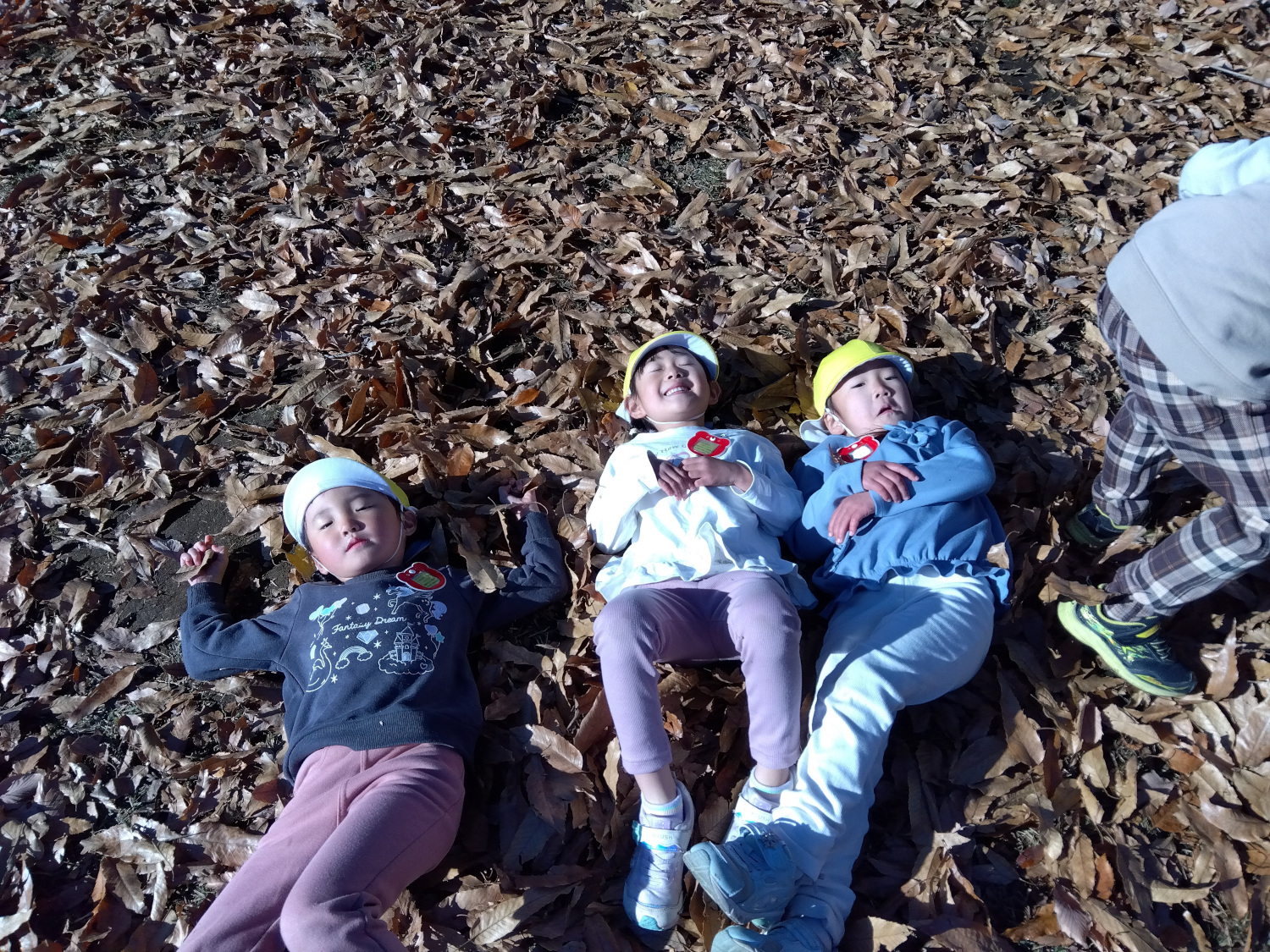 たくさんの落ち葉を協力して集めていた幼児クラスの子どもたちの様子を見守ってみると、この後は大きな落ち葉の山が出来ていました。秋から冬でしか味わうことのできない遊び方ですね。子どもたちの発想にも驚かされます。