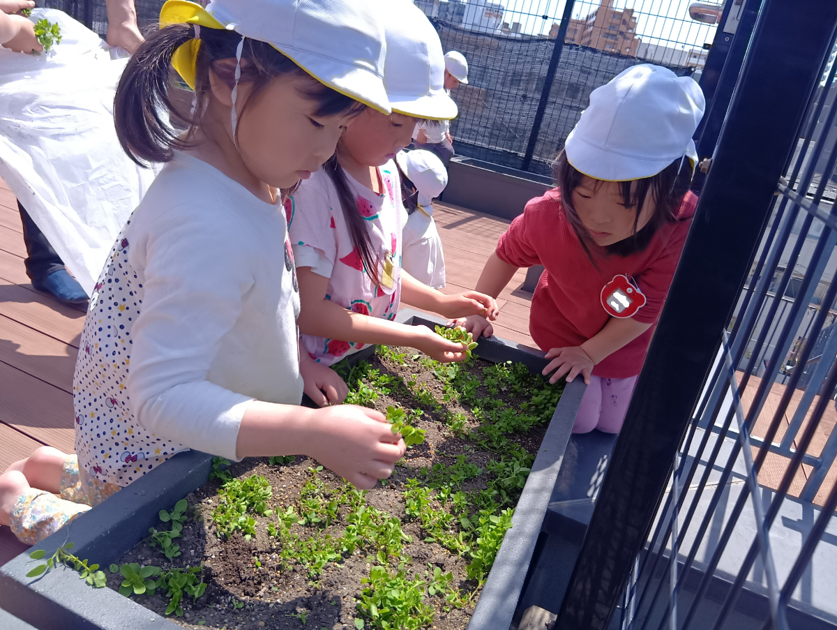 根っこがしっかり張っている畑の雑草をゆっくり揺らしながら抜きます。「保育者が根っこも取らないと野菜の栄養とられちゃうからね。」というと、しっかり根っこが取れるようにそれぞれゆっくり取ったり、深い所から抜こうとしたり考えて取ってくれました。きれいに取れると「先生!根っこもきれいに取れたよ」と教えてくれます。