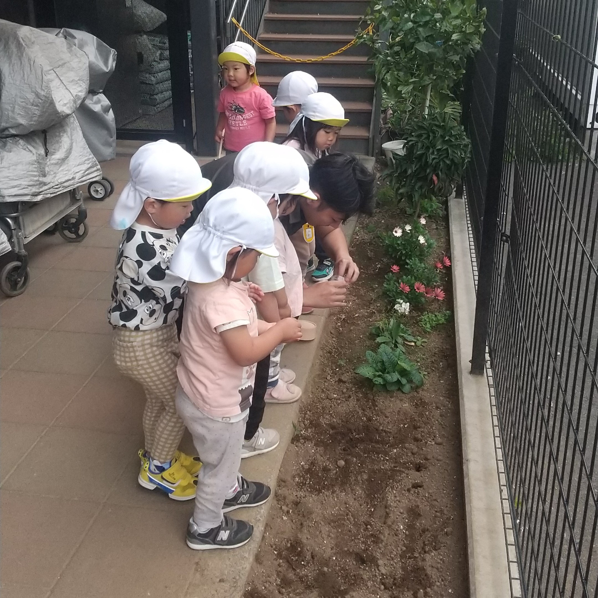 畑の準備が出来ると、種を植えていきます。保育者と一緒に穴をあけた場所にそっと種を撒いて、種まき完了です。一粒ずつ撒いたり、手に持っている物をバサッと撒いたりそれぞれ特徴が出ます。