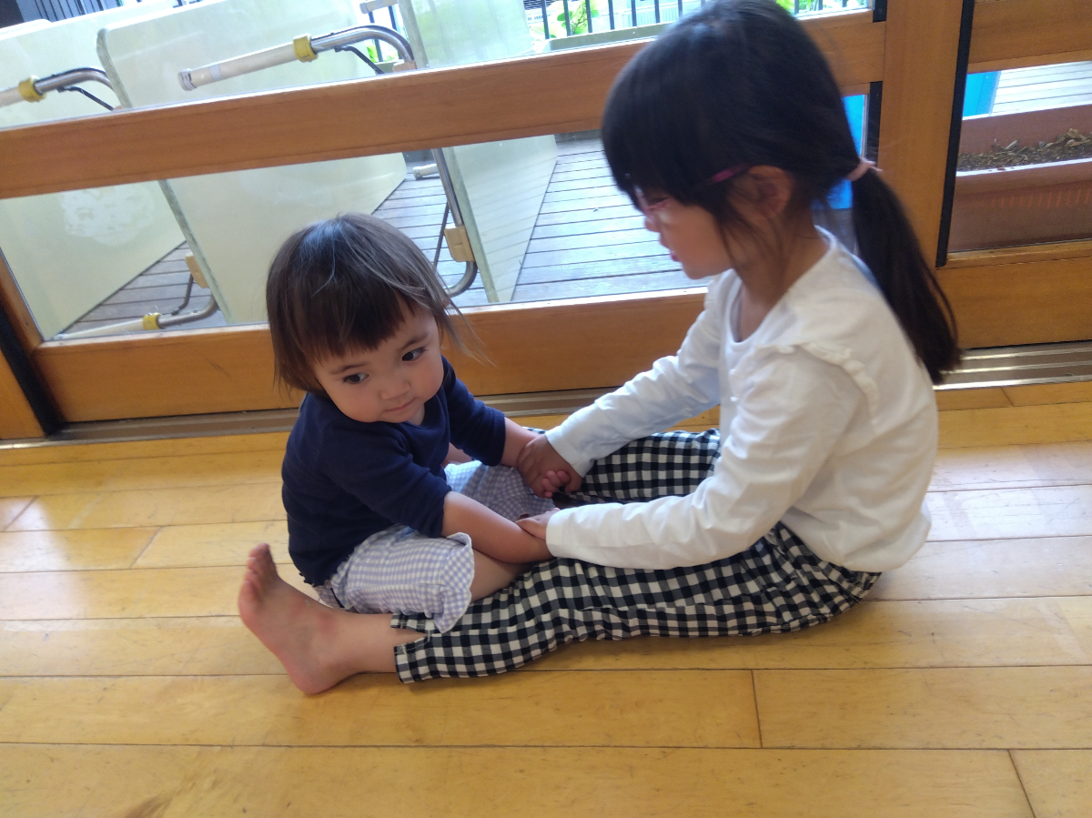 同じフロアで一緒にリズム体操をすることもあり、年長児の迫力に圧倒されることもありますが優しく誘ってもらい喜んで参加しています。